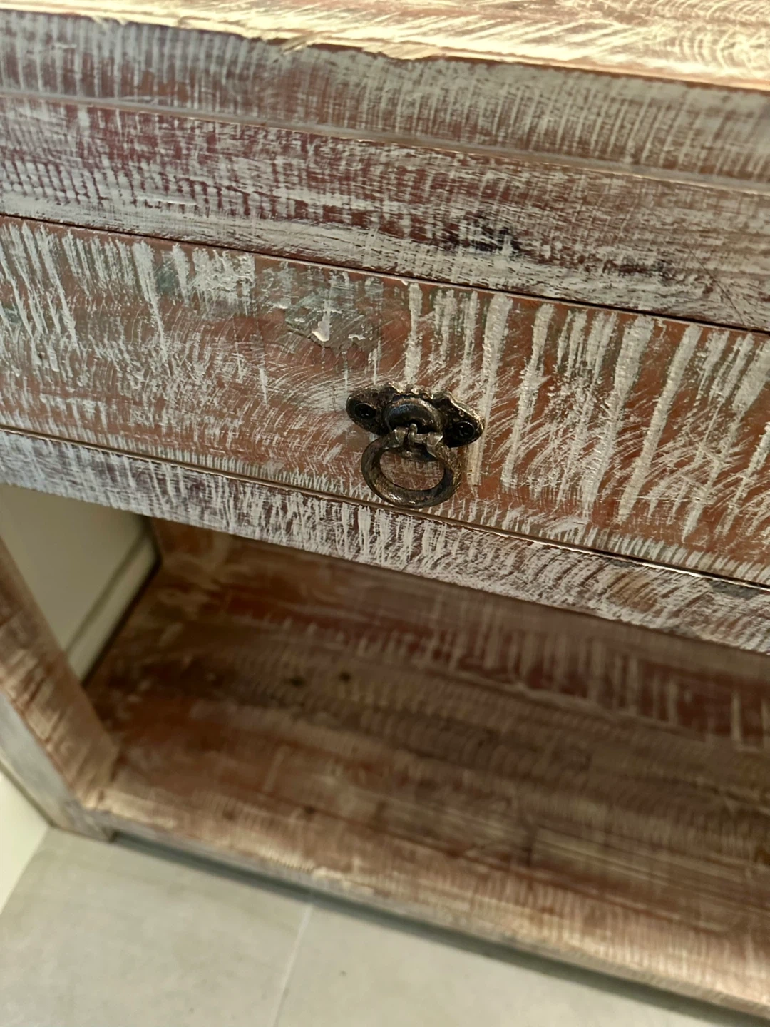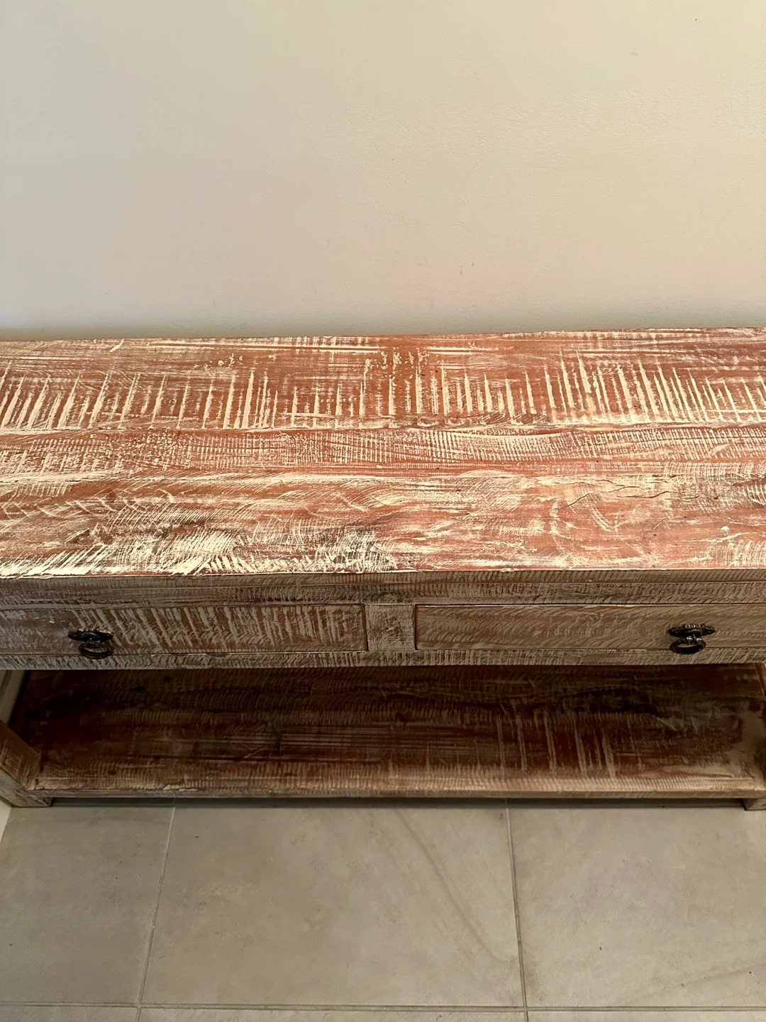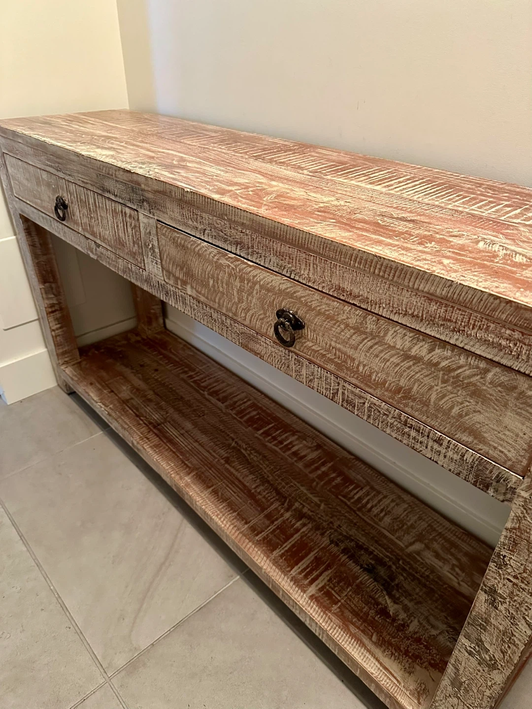 Excellent condition, very clean solid hardwood condole table. Ideal for hallway or entrance, living room or den storage / organization. Two deep drawers; no assembly; versatile; very durable styling. Selling a rustic wooden console table. This piece would add a touch of vintage charm to any entryway or living space