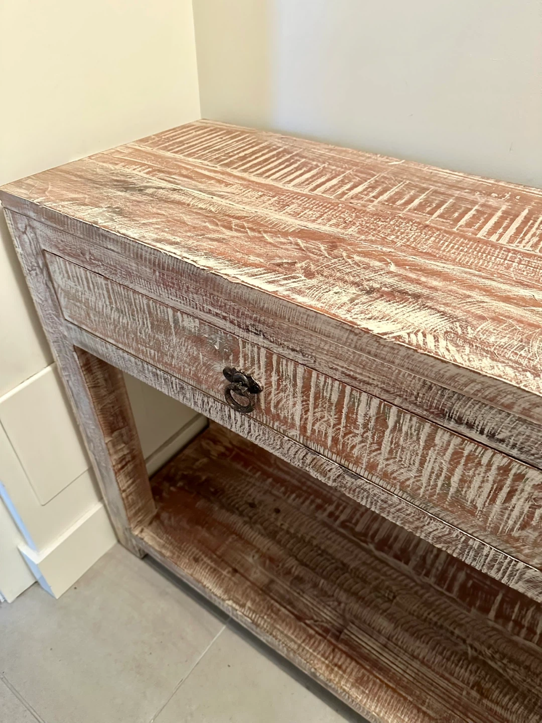 Excellent condition, very clean solid hardwood condole table. Ideal for hallway or entrance, living room or den storage / organization. Two deep drawers; no assembly; versatile; very durable styling. Selling a rustic wooden console table. This piece would add a touch of vintage charm to any entryway or living space