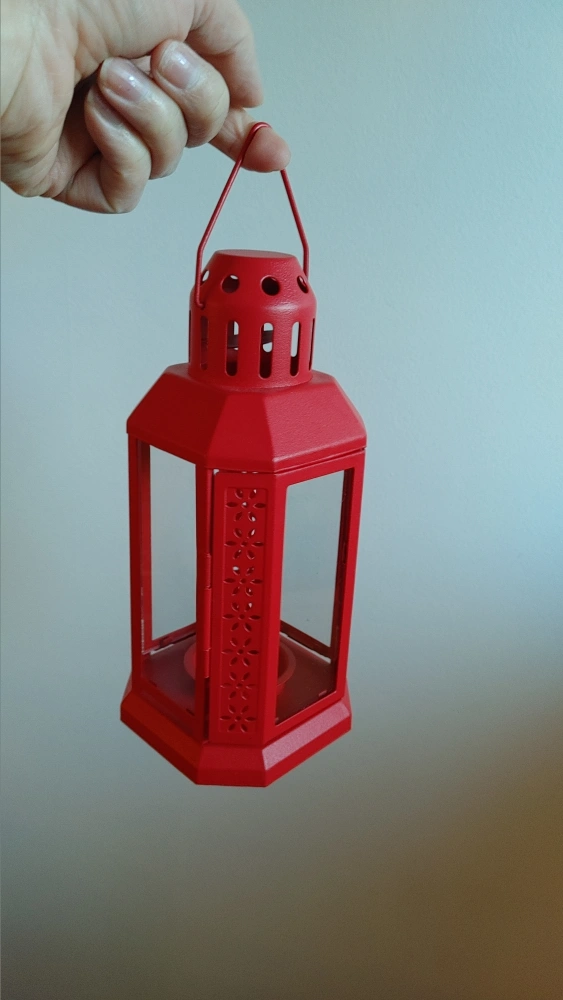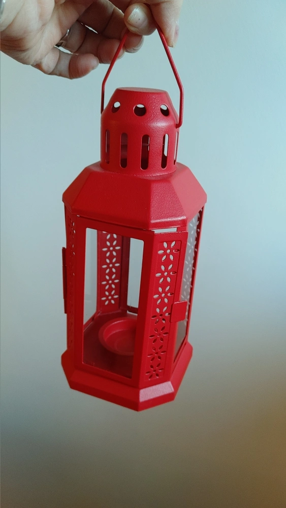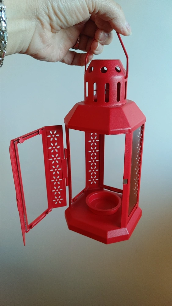 A lovely red metal candle lantern! It has a hinged door for easy access to the candle holder inside. The lantern features a decorative floral cutout design, adding a touch of charm to any space