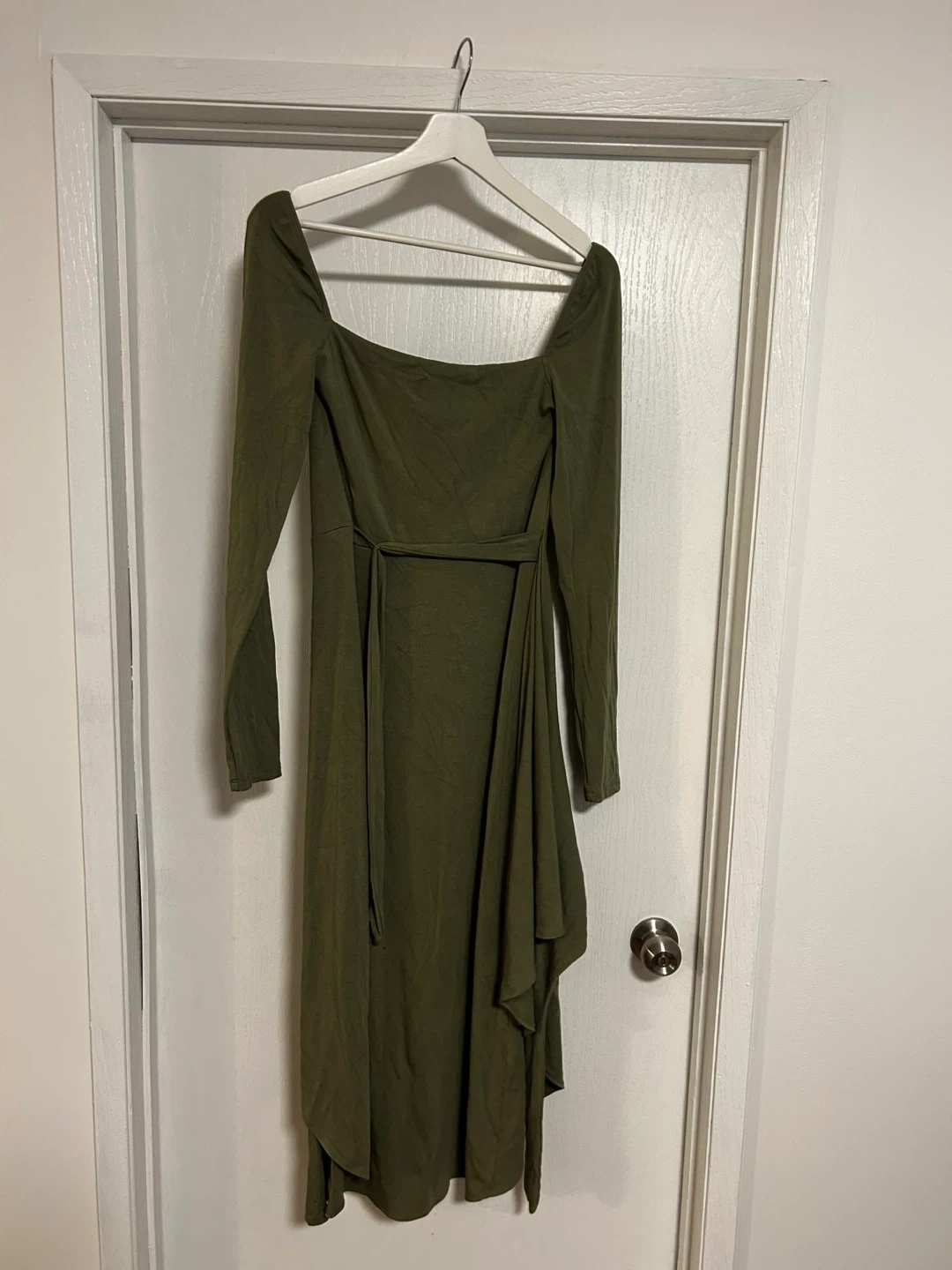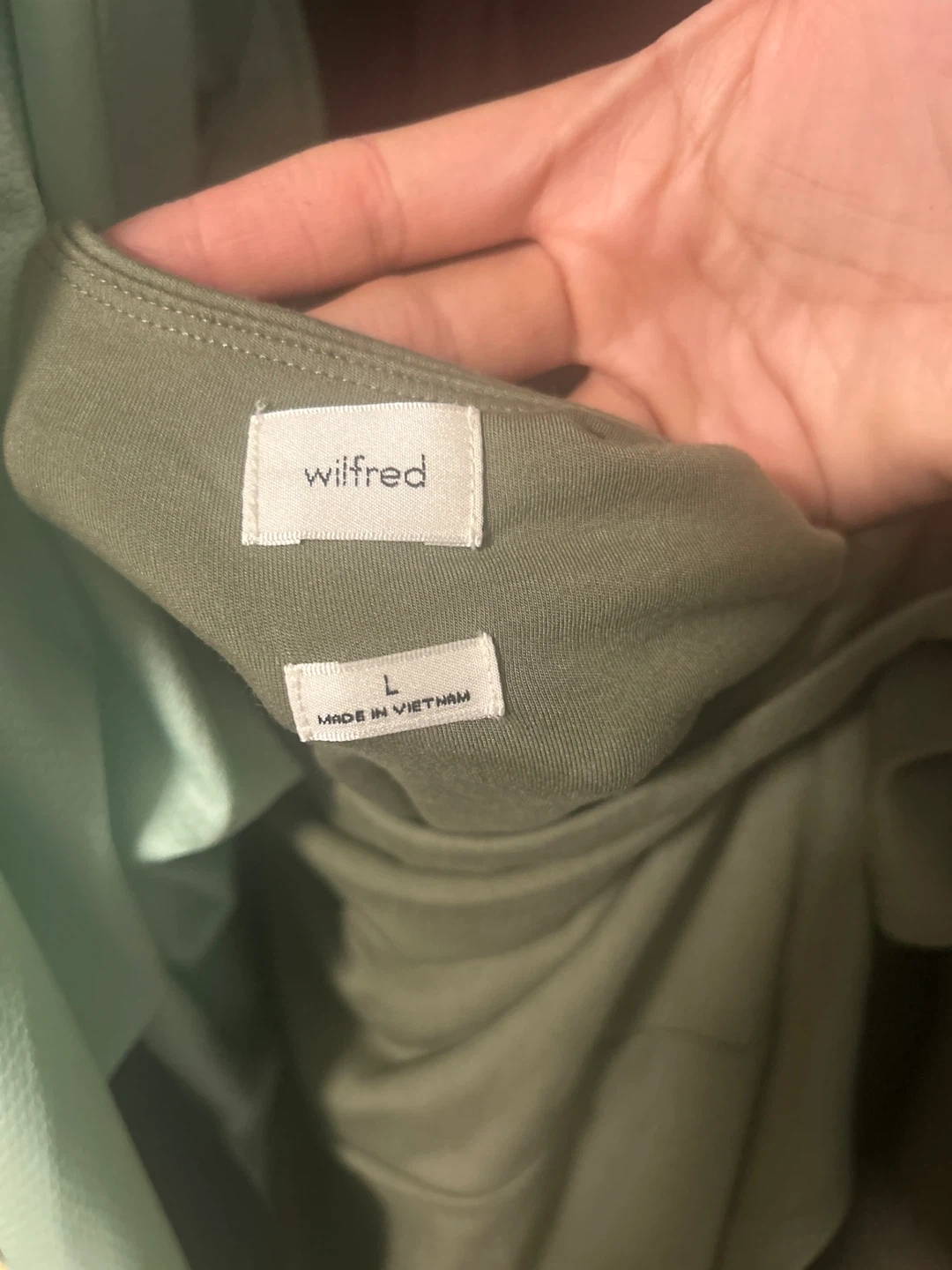 Selling a Wilfred dress in olive green! It's a size large and has a unique wrap design. Perfect for dressing up or down!