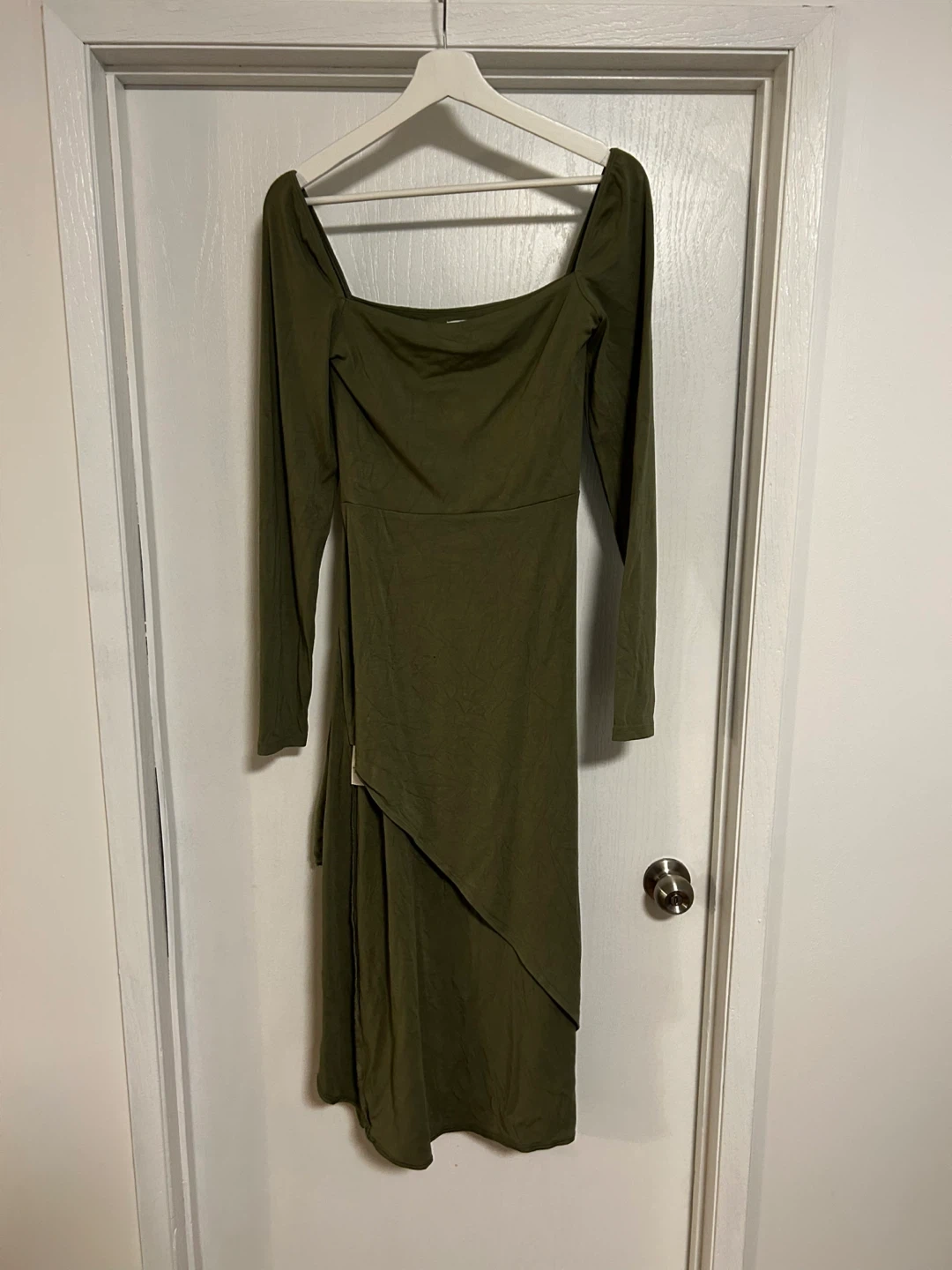 Selling a Wilfred dress in olive green! It's a size large and has a unique wrap design. Perfect for dressing up or down!