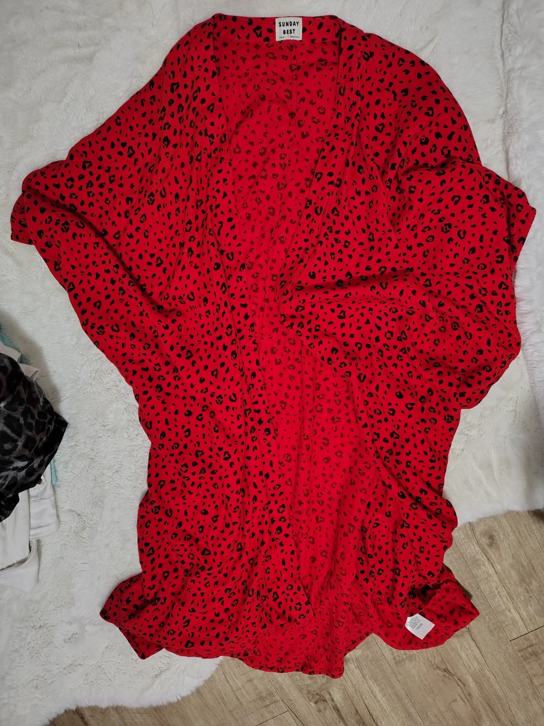 This Sunday Best kimono is a vibrant addition to any wardrobe! The red fabric with black cheetah spots creates a fun and stylish look. Perfect for layering or adding a pop of colour to your outfit especially in these now sunny days!