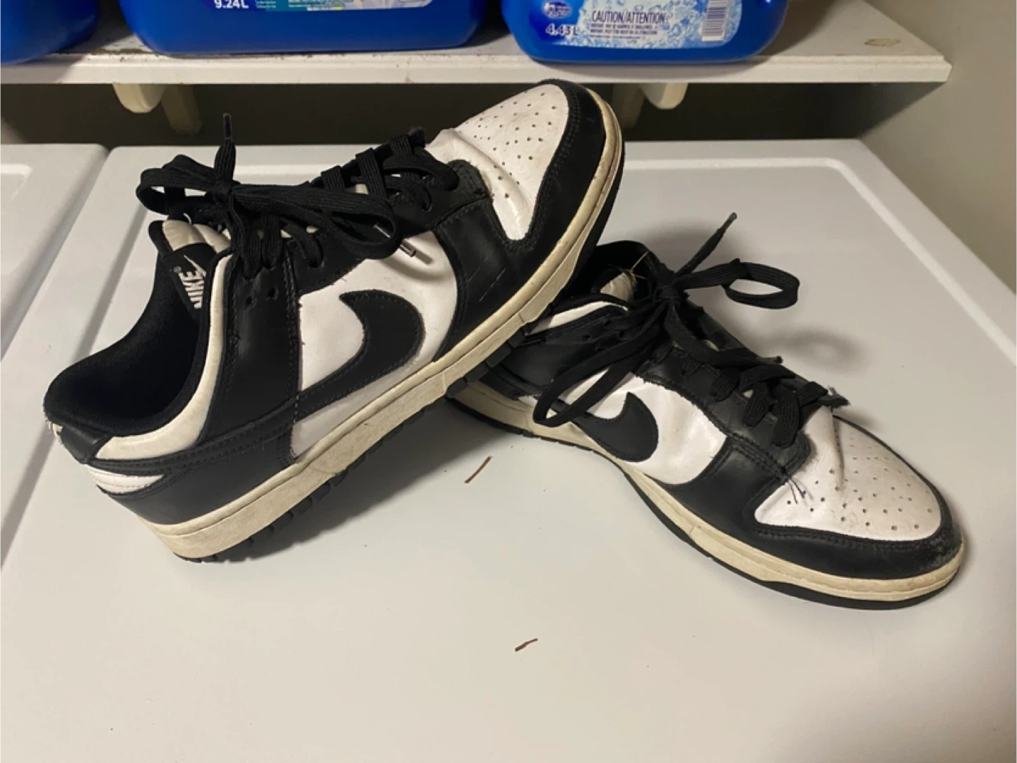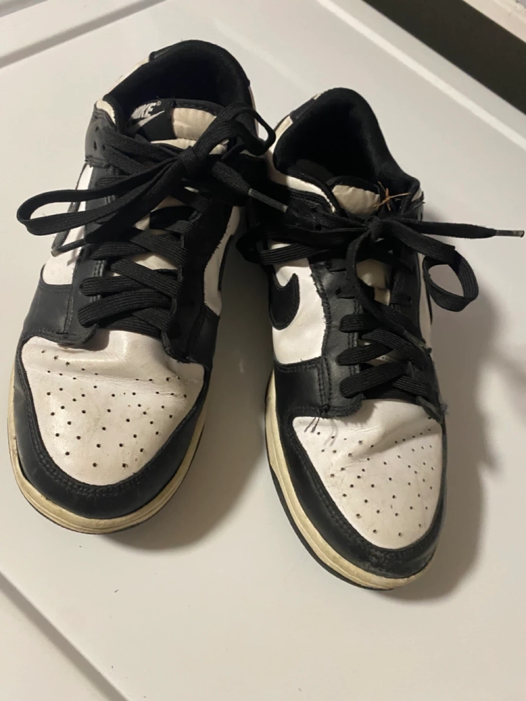 Selling a pair of Nike Dunk Low Panda sneakers in size 9.5. They're in okay condition with some signs of wear, as shown in the photos. A classic style that goes with everything!