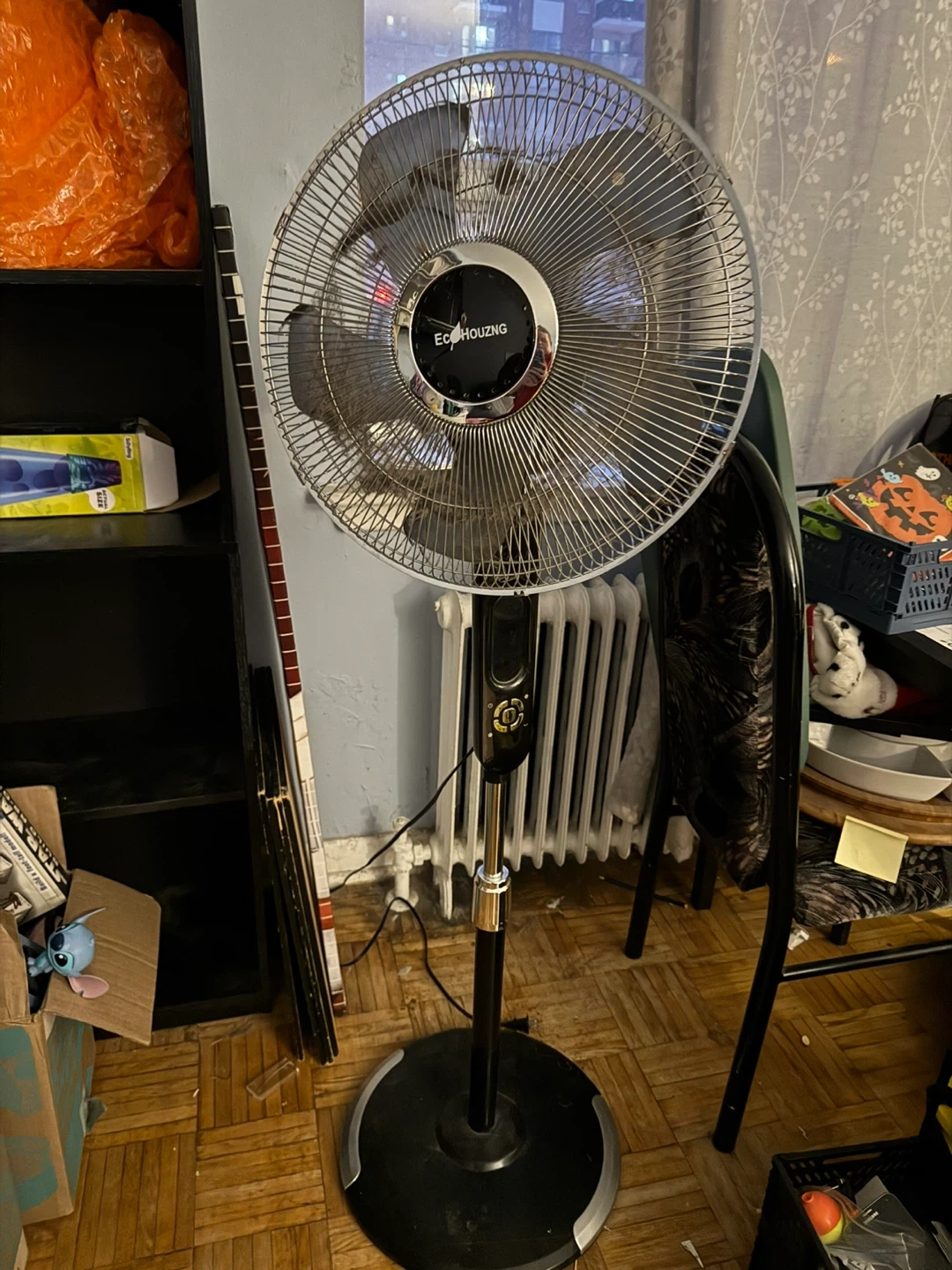 Selling an Ecohouzng stand fan in good condition. It features a black base and a silver metal grill. Perfect for keeping cool during the warmer months!