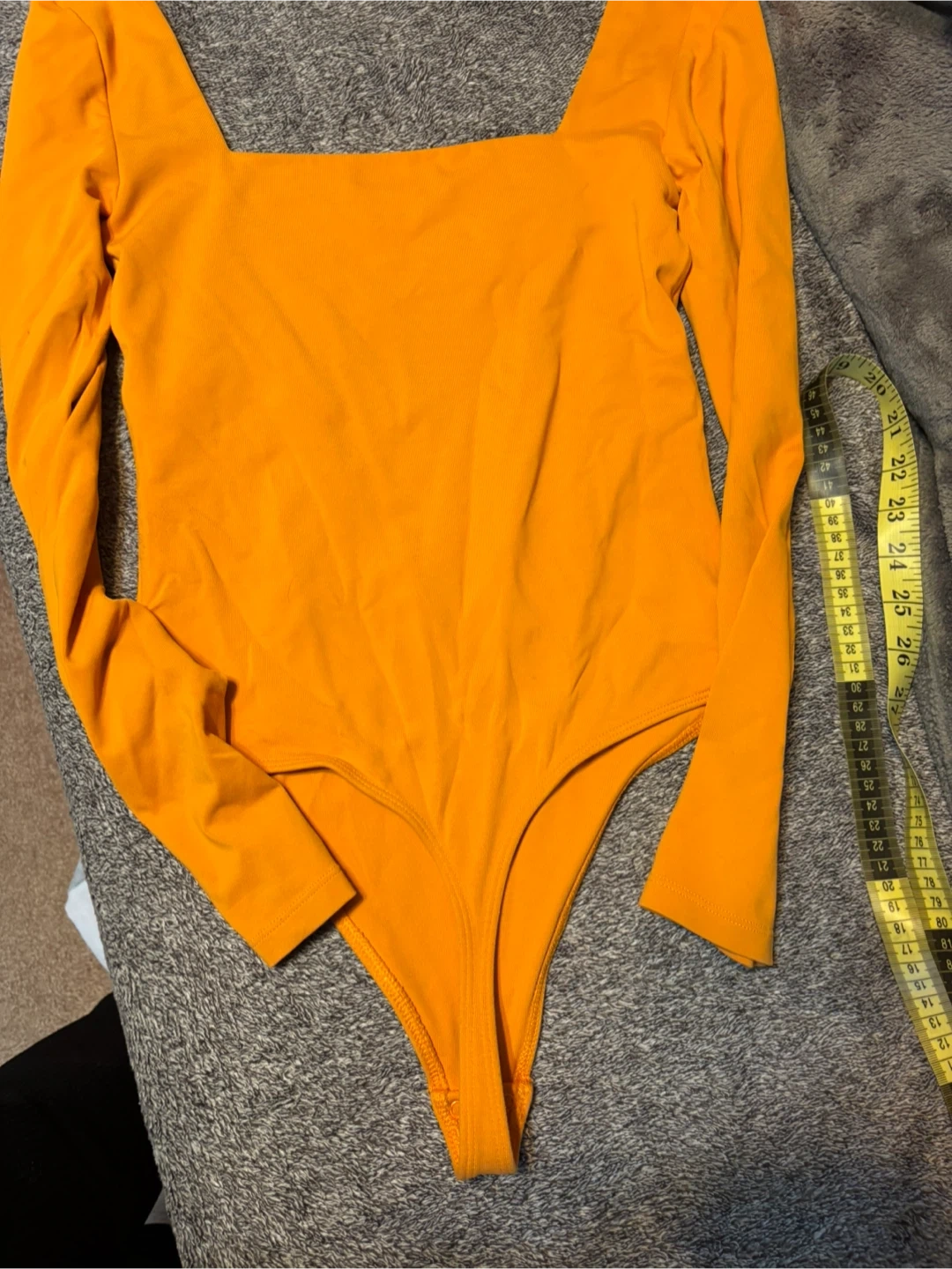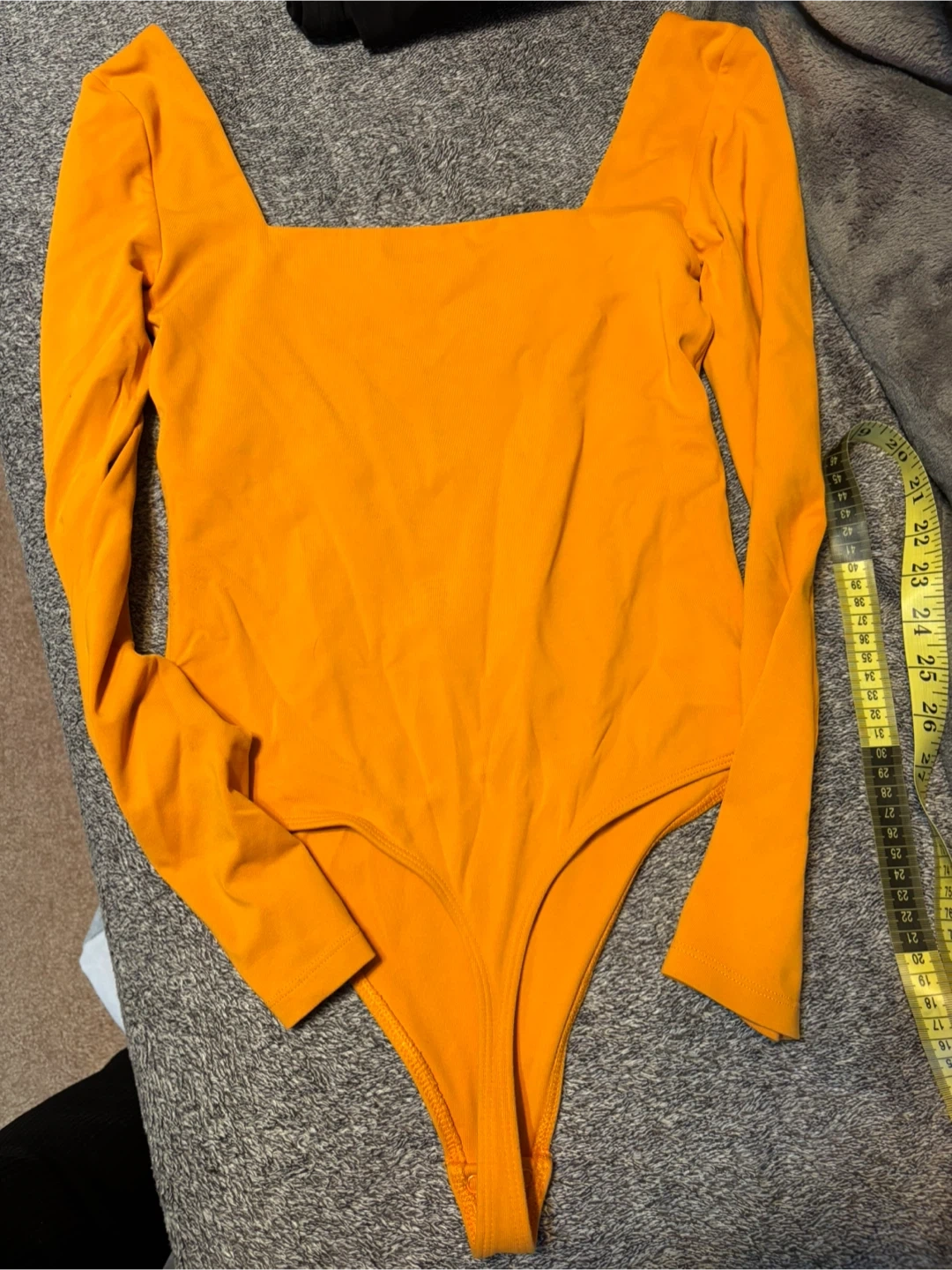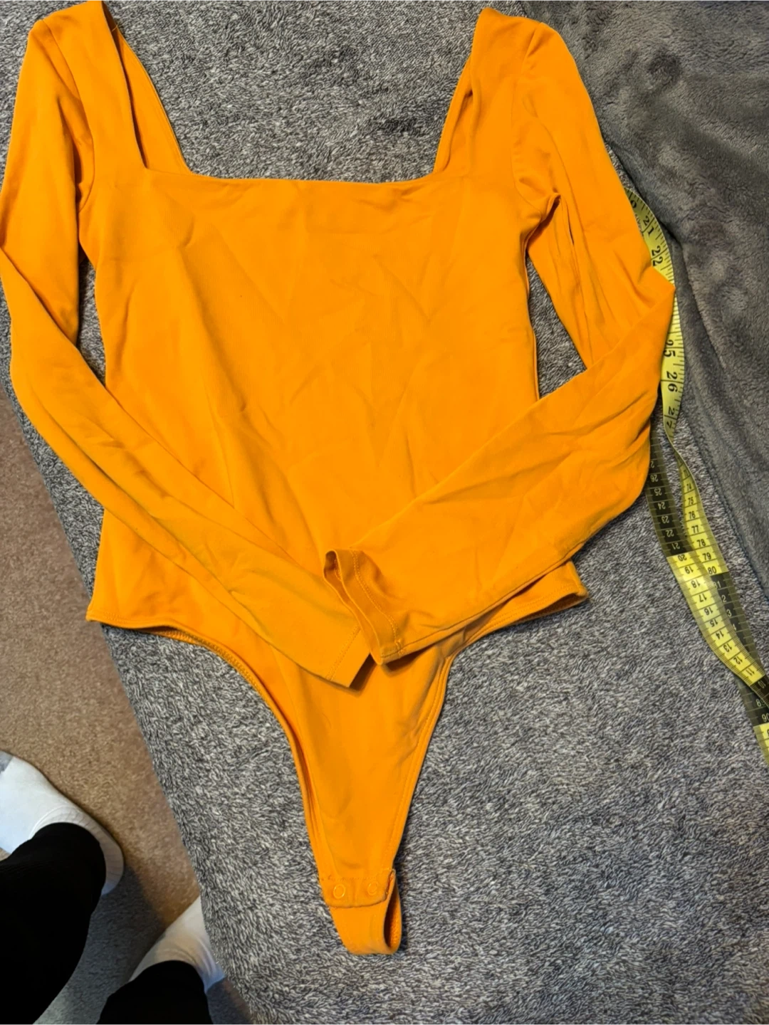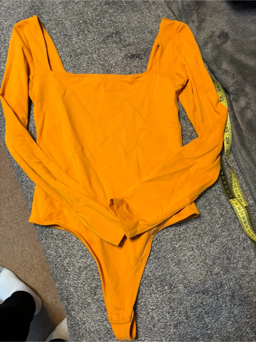 vibrant orange bodysuit from Babaton! It's a size medium and in great condition. The material feels soft and comfortable, perfect for adding a pop of colour to your wardrobe