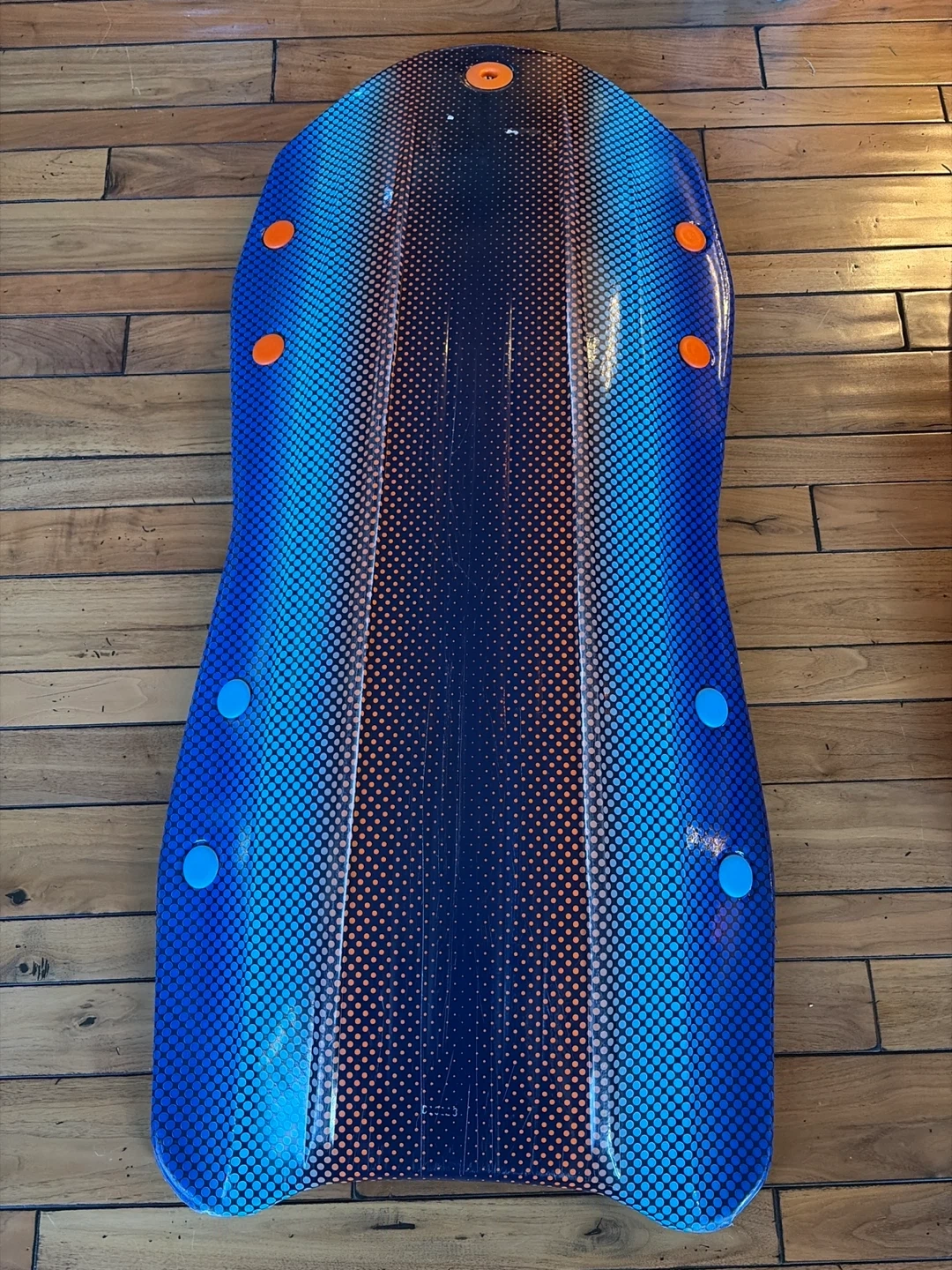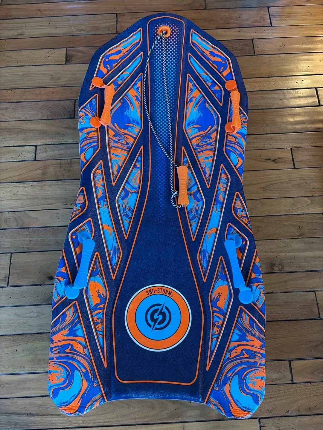 Selling a Sno-Storm sled in great condition! It's ready for some winter fun. The sled features a cool blue and orange design. Perfect for kids and adults alike who want to enjoy a day on the snow hills
