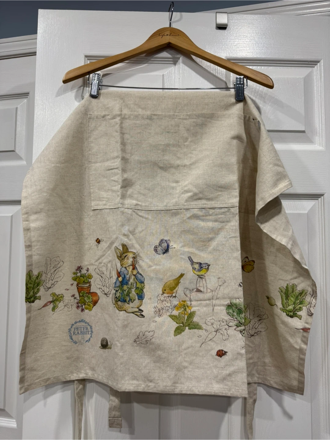 Williams Sonoma apron featuring the adorable Peter Rabbit design! The material is a lovely neutral linen colour and it has a handy pocket on the front
