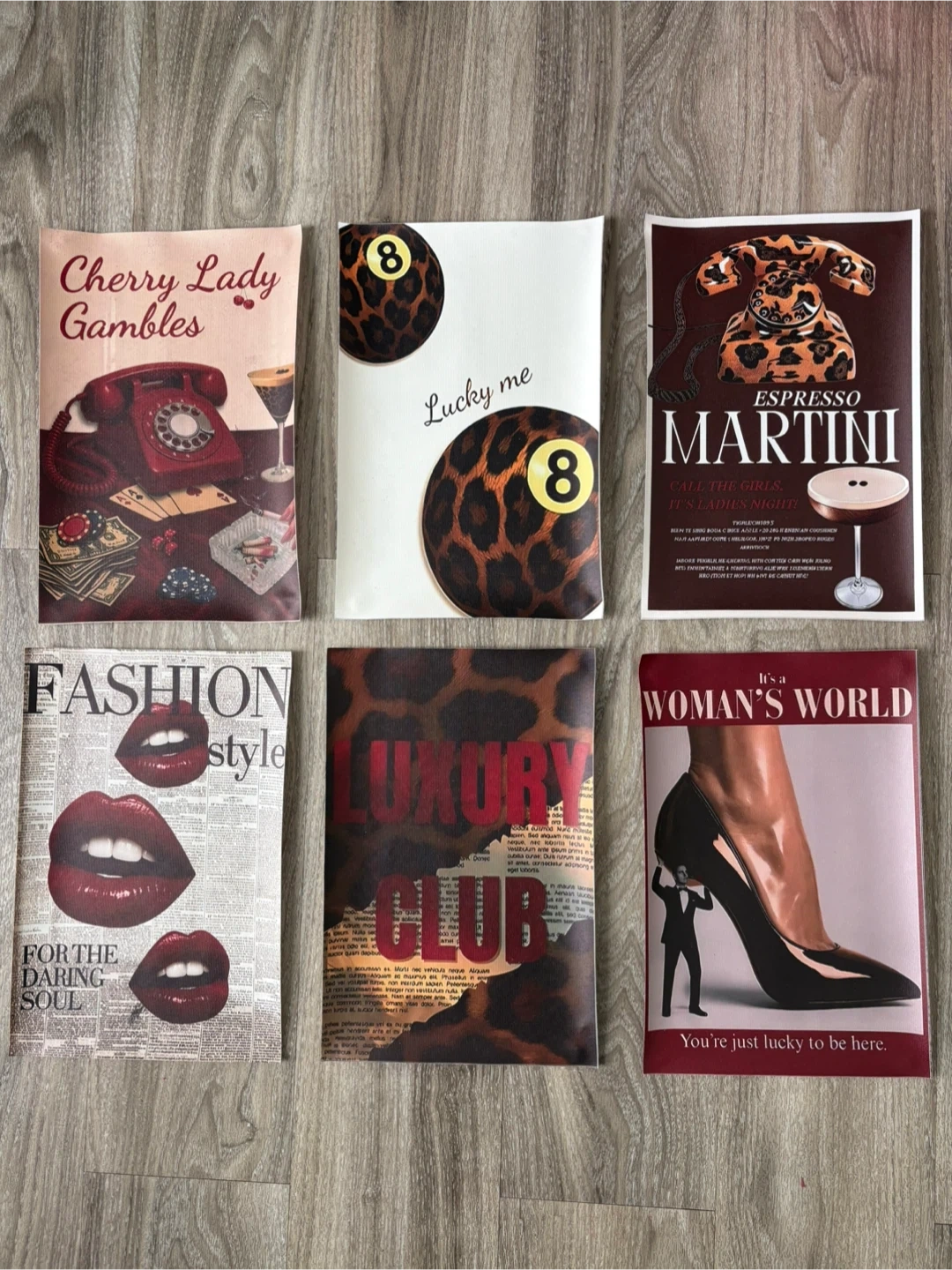 These covers feature eye-catching prints such as 'Cherry Lady Gambles,' 'Lucky Me,' 'Espresso Martini,' 'Fashion Style,' 'Luxury Club,' and 'It's a Woman's World'.