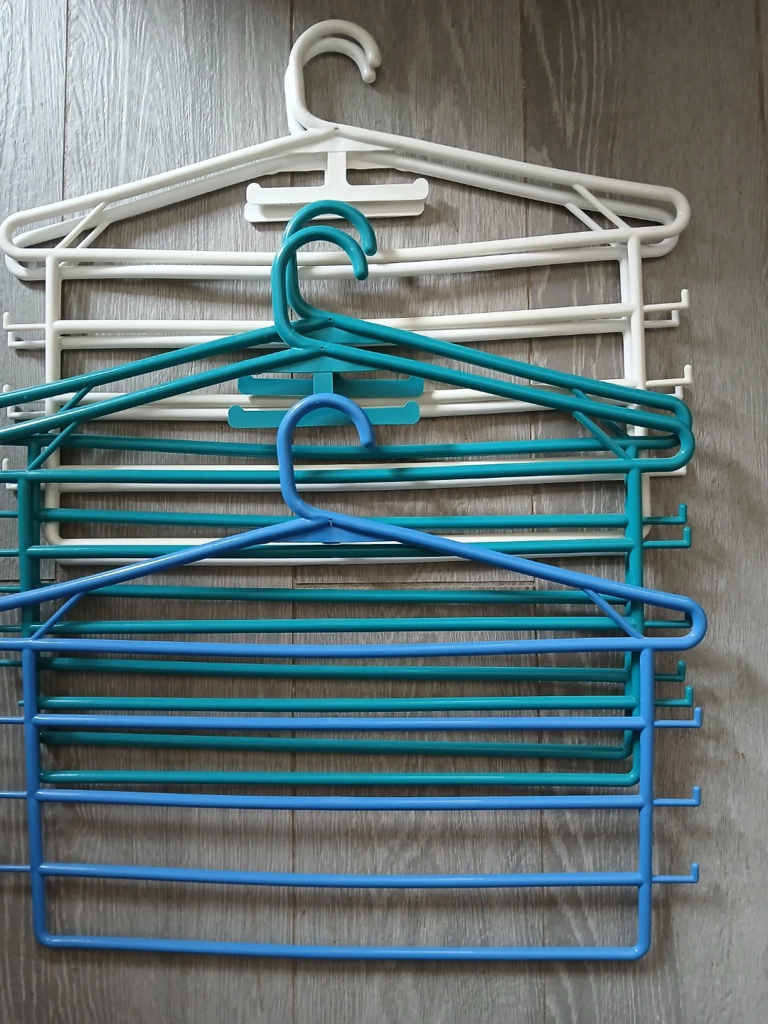 Selling a set of five multi-tier clothes hangers! There's two in white, two in teal, and one in blue. Great for maximizing closet space and keeping your clothes organized.