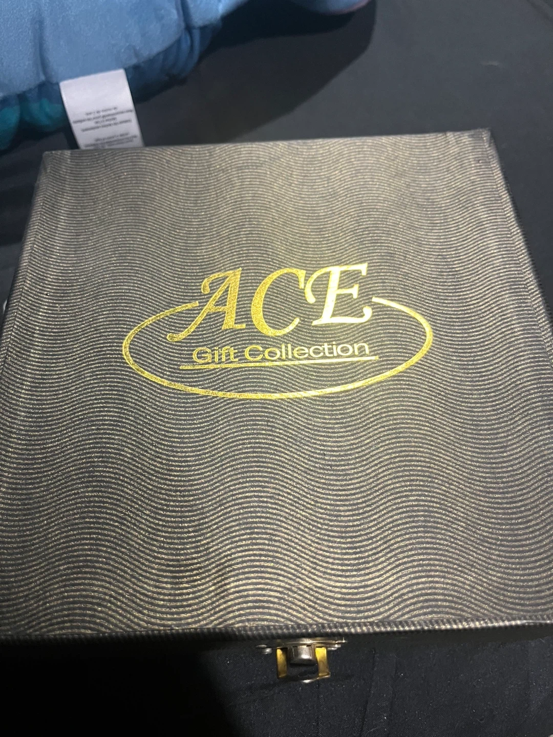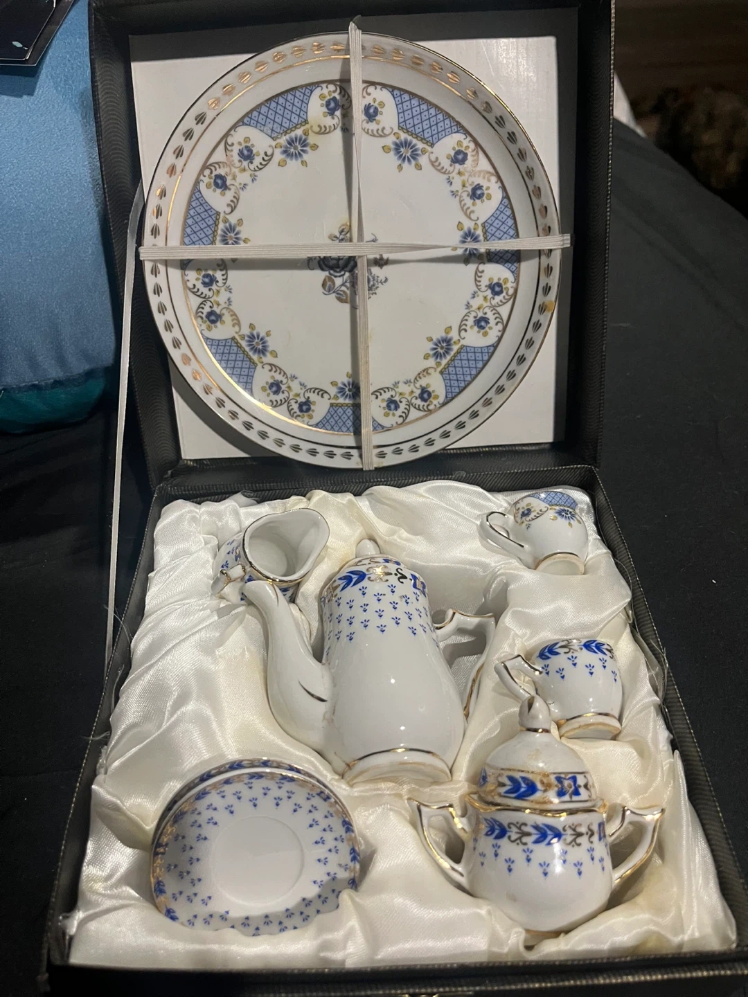 Selling an ACE Gift Collection tea set. It's a beautiful set with a white and blue floral pattern and gold trim. Includes a teapot, sugar bowl, creamer, four cups, four saucers, and a serving plate. Comes in the original box!
