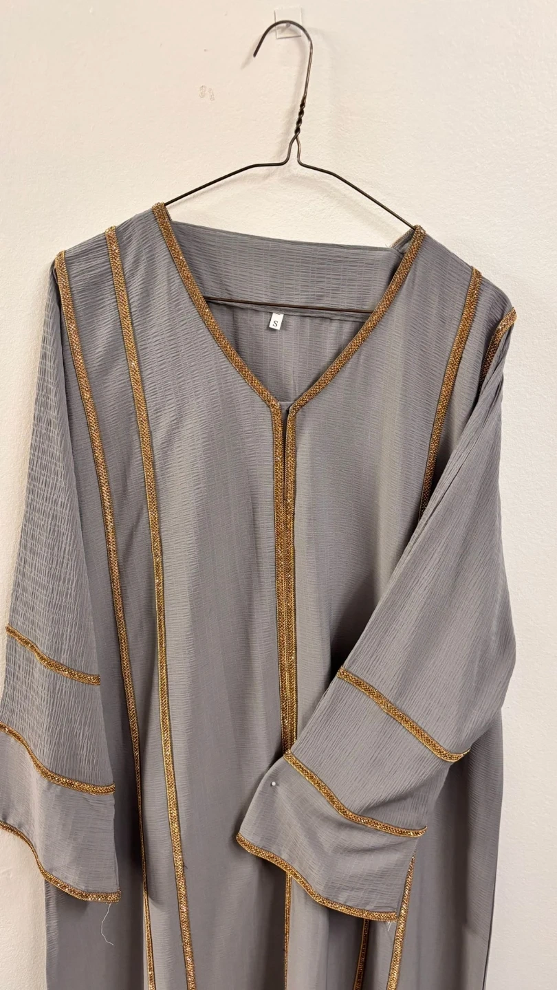 Selling a lovely grey dress with gold trim detailing! It's a size small and brand new. Perfect for a special occasion or just adding a touch of elegance to your wardrobe