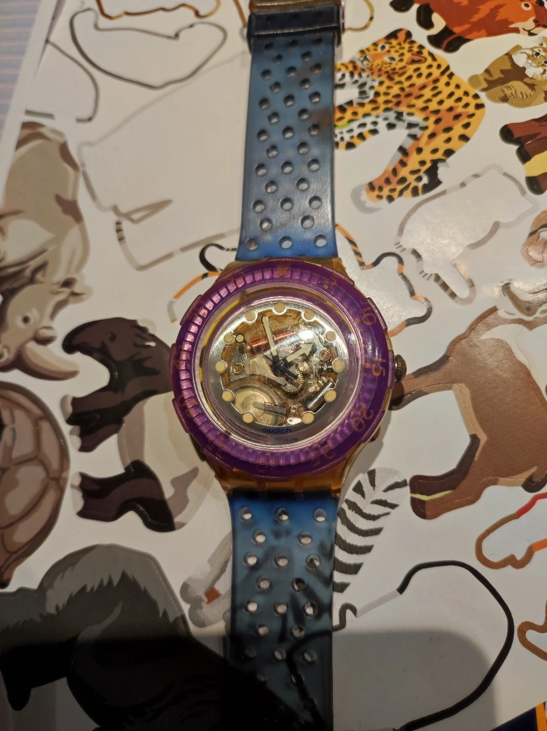 Selling a Swatch Jellyfish watch! It has a clear case and a blue and purple band. It's in good condition for its age, with some minor wear and tear on the band.