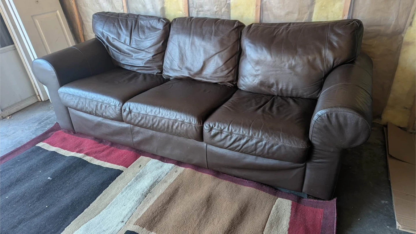 Selling a comfy three-seat sofa! It's a dark brown leather and would be great for a living room or rec room or basement it’s very comfortable no damaged no scratches non smoking house no pets