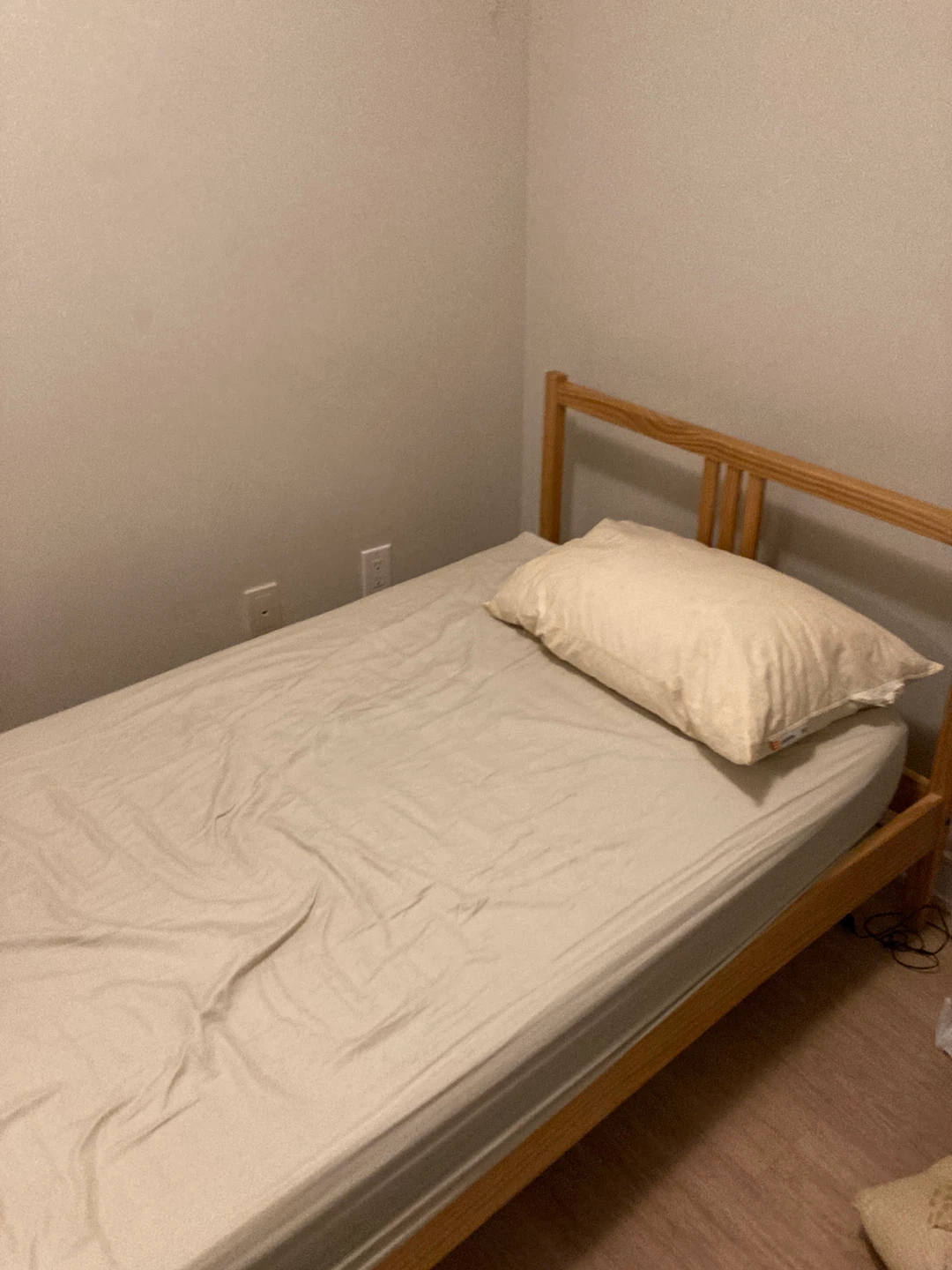 Selling a twin size bed frame with mattress and pillow. It's in good condition, and comes from a pet-free, smoke free, pest free home.
