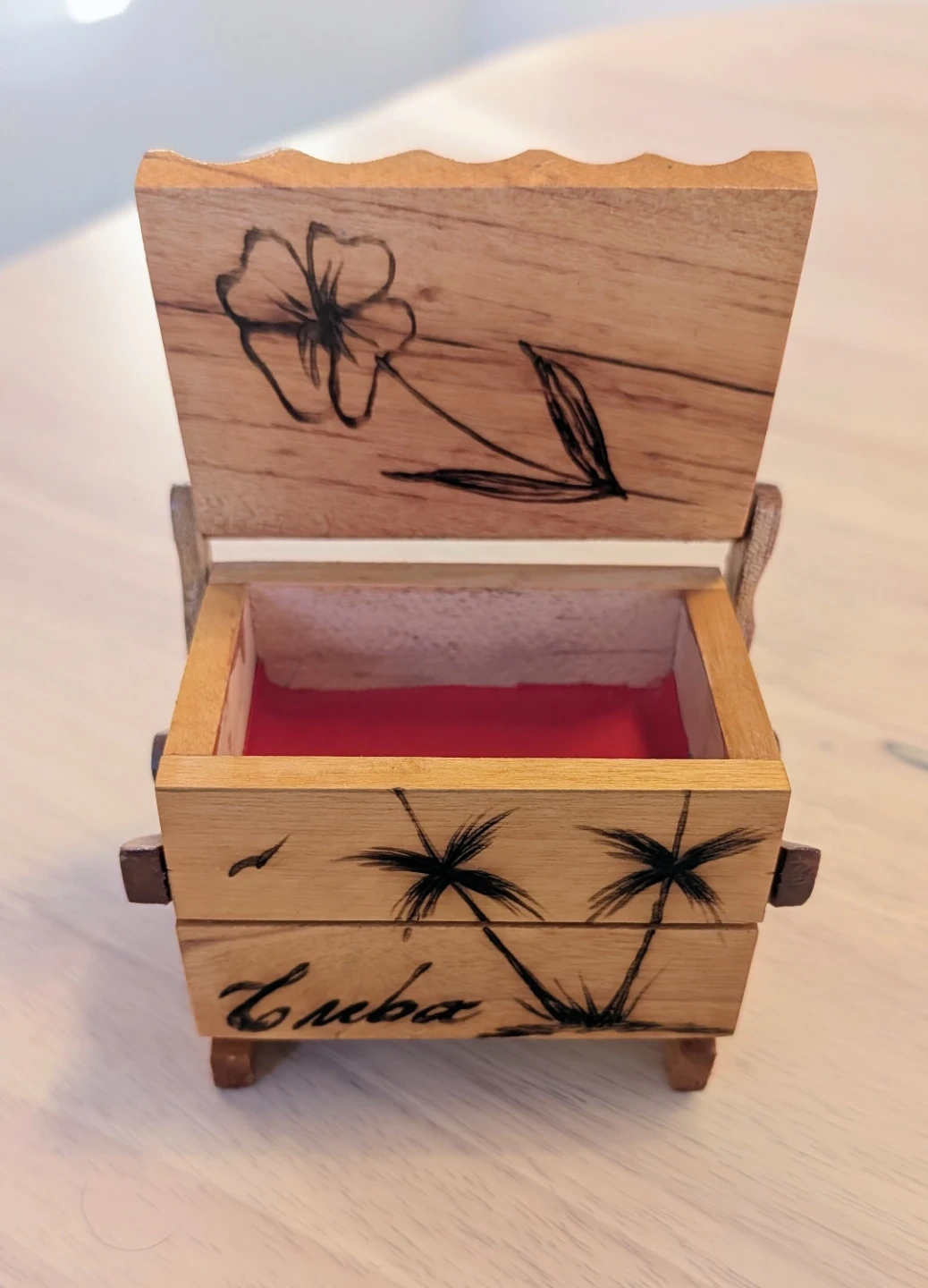 A cute little wooden trinket box featuring a design with palm trees and the word 'Cuba' on the front. The inside is lined with red felt, and the lid has a floral design. Perfect for storing small jewelry or keepsakes
