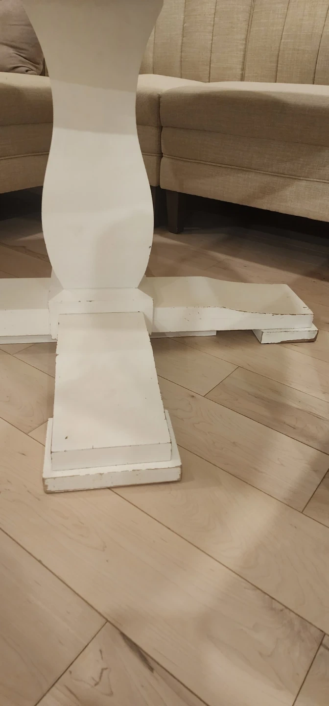 Selling a round dining table with custom made glass top. Table has marks on the surface and on the legs and could use a coat of paint. It is very sturdy and sets up to 6 people.