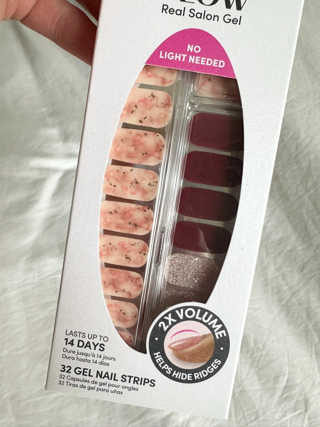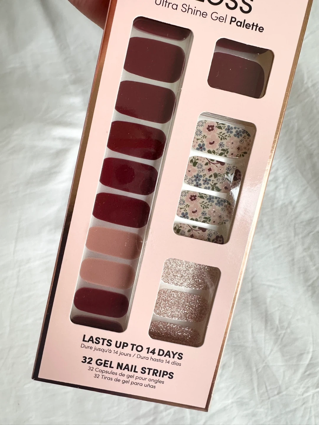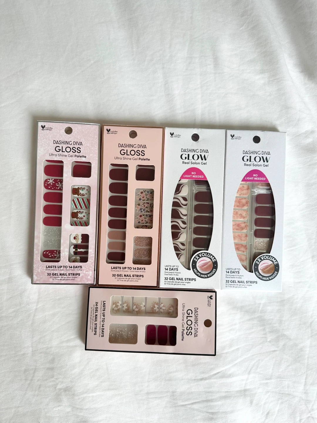 4 Packages contains 32 gel nail strips, 1 package contains 24 gel nail strips, prep pad, nail file, and instructions.