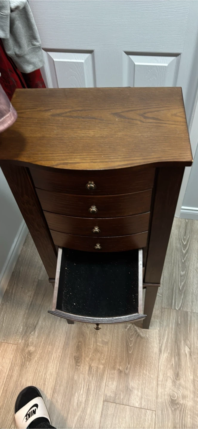 Selling a jewellery armoire in good condition. It has a dark brown wood finish and features several drawers and compartments for organizing your jewellery. There are also hooks inside the door for hanging necklaces and bracelets. It's a great piece to keep your valuables safe and organized