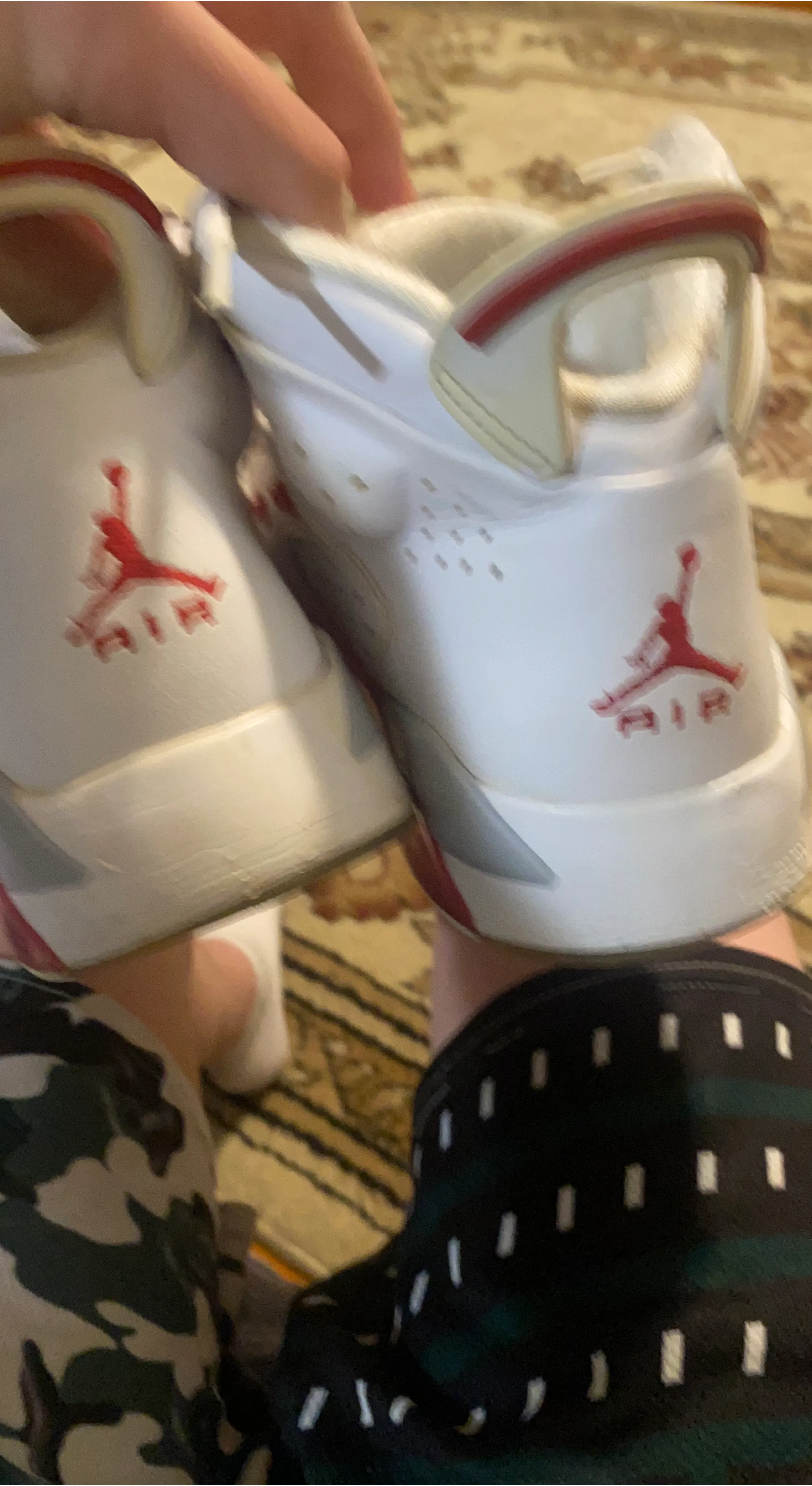 Selling a pair of Air Jordan 6 Retro sneakers in white and red. They feature the iconic Jumpman logo. Please take a look at the photos to assess the condition
