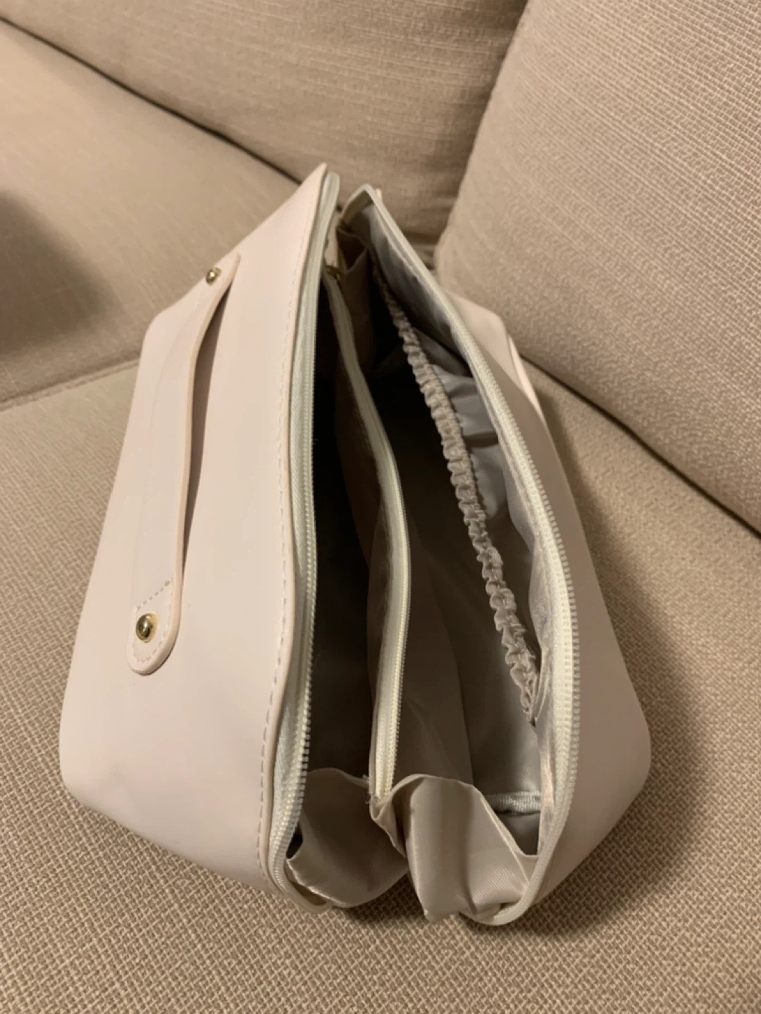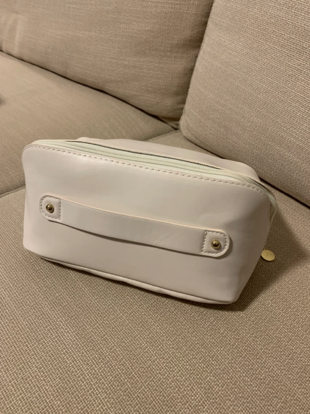 Selling a handy off white cosmetic or travel pouch! It's in great condition and perfect for keeping your essentials organized on the go. It has a handle for easy carrying and a zippered closure to keep everything secure.