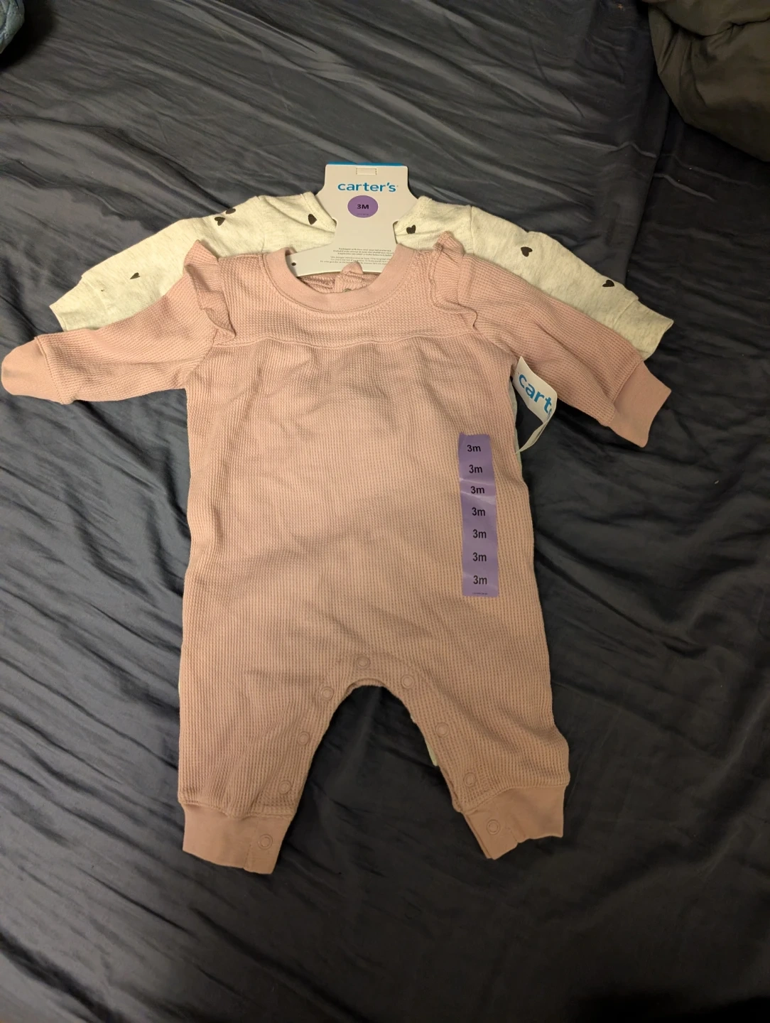 Two adorable baby rompers from Carter's, both size 3M and brand new with tags! One is a soft pink waffle knit, and the other is a grey and white print. Perfect for your little one!