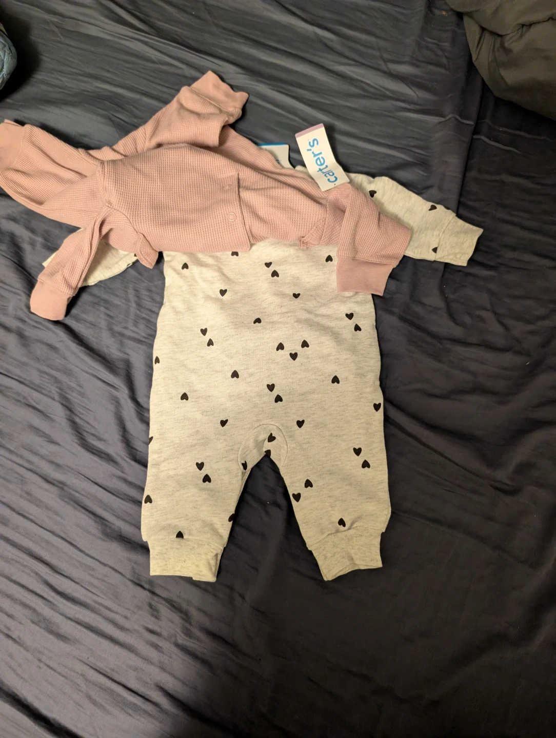 Two adorable baby rompers from Carter's, both size 3M and brand new with tags! One is a soft pink waffle knit, and the other is a grey and white print. Perfect for your little one!