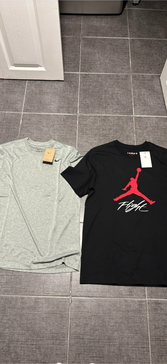 Two brand new t-shirts, both with tags still attached! One is a grey Nike tee, and the other is a black Jordan tee featuring the iconic Jumpman logo and 'Flight' design