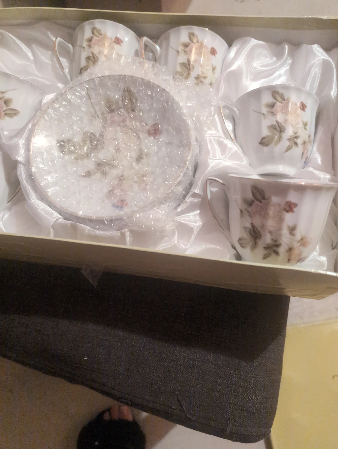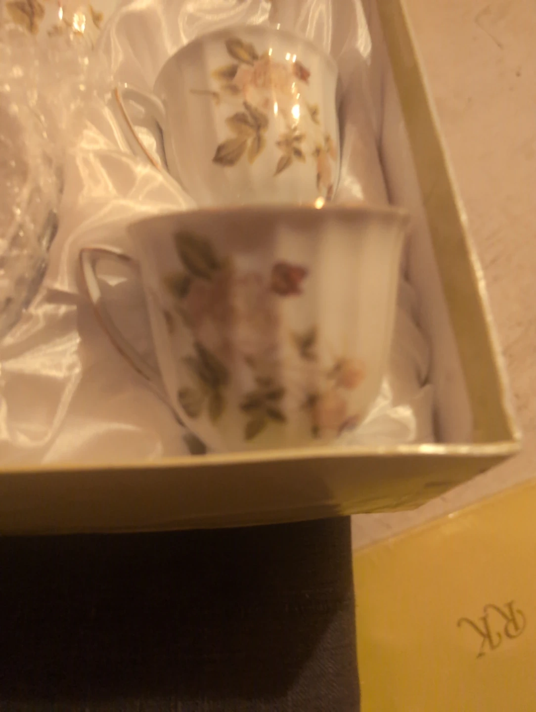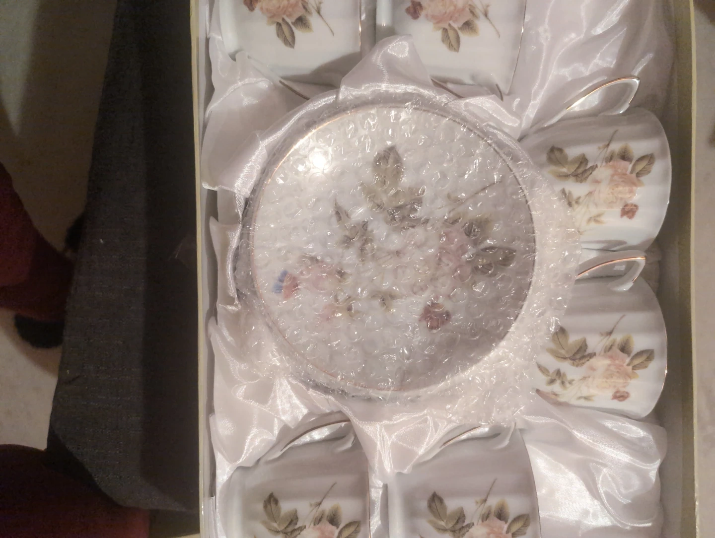 Tea cup set with a delicate rose design. It comes in its original box, making it perfect for gifting or adding a touch of elegance to your tea time 6pieces