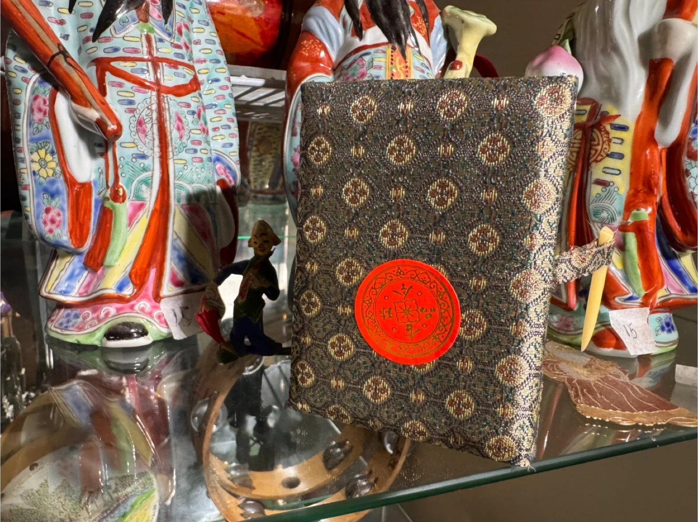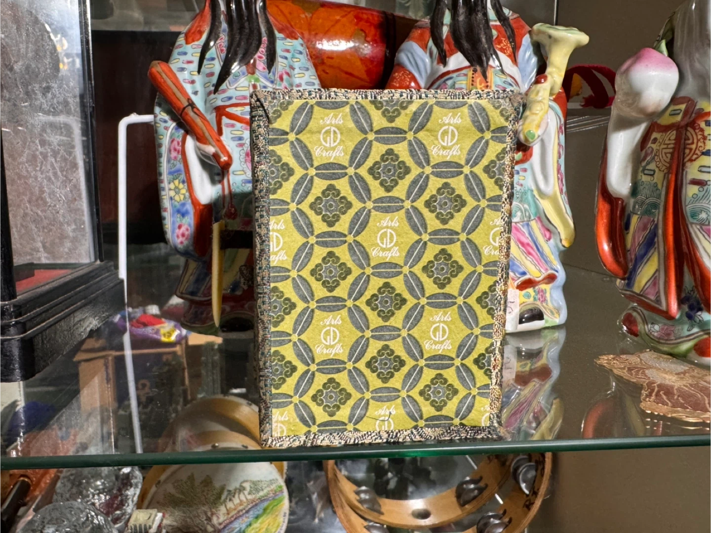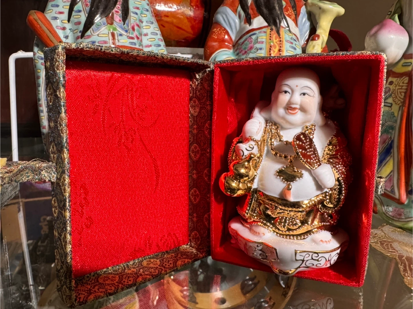 Selling a charming vintage Arts & Crafts Buddha figurine, complete with its original decorative box. The box itself is a work of art, featuring intricate patterns and a lovely color scheme. The figurine is in great condition and would make a wonderful addition to any collection or a unique decorative piece for your home