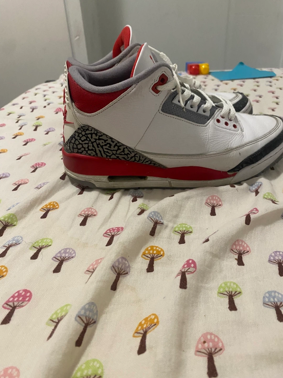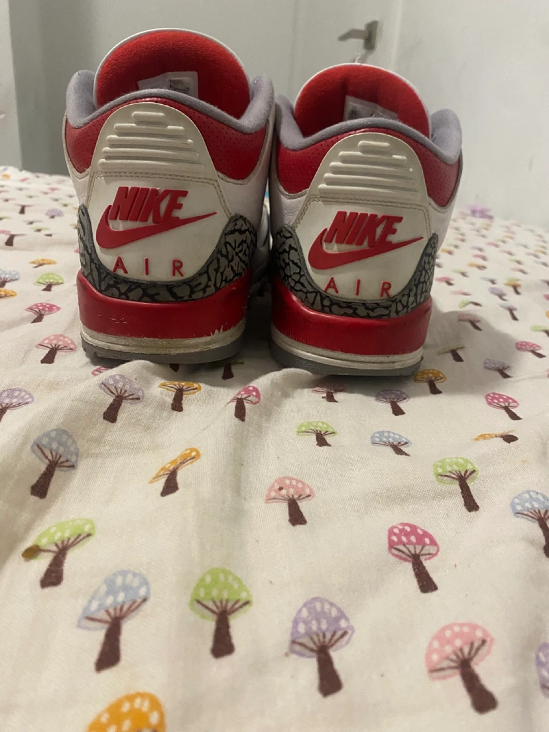 Selling a pair of Nike Air Jordan 3 Retro sneakers in white and red. They show some signs of wear but still have plenty of life left. Great for casual wear or hitting the court!