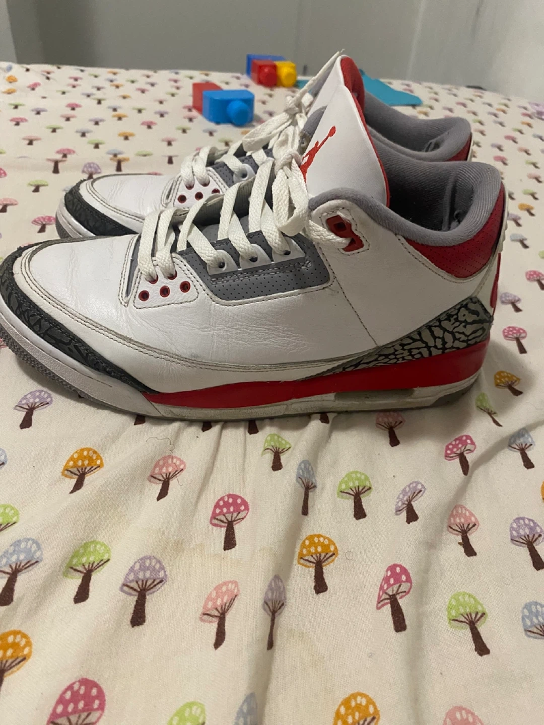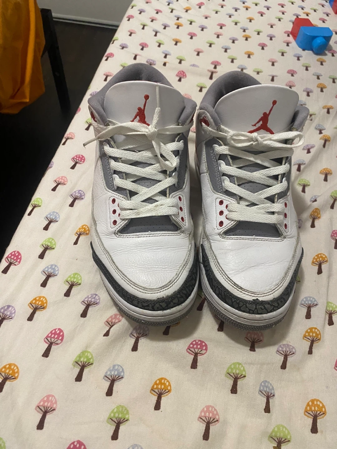 Selling a pair of Nike Air Jordan 3 Retro sneakers in white and red. They show some signs of wear but still have plenty of life left. Great for casual wear or hitting the court!