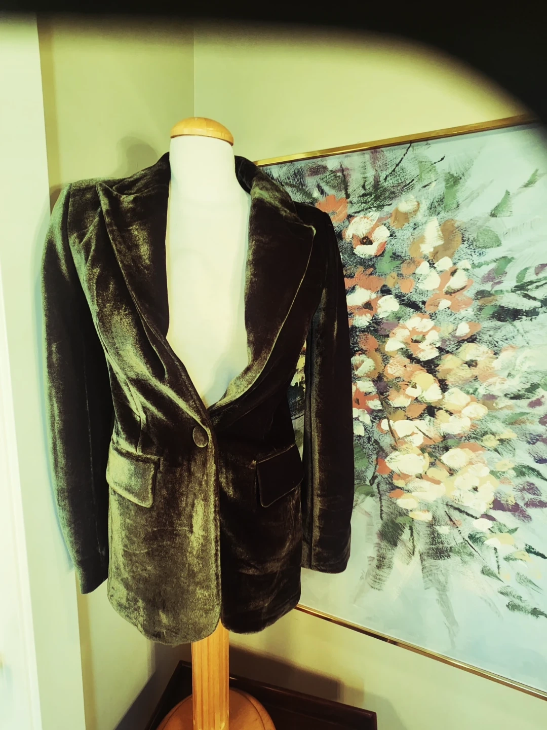 A stylish velvet blazer in a lovely green colour. It's in great condition and ready to add a touch of elegance to your wardrobe! Size xs/small