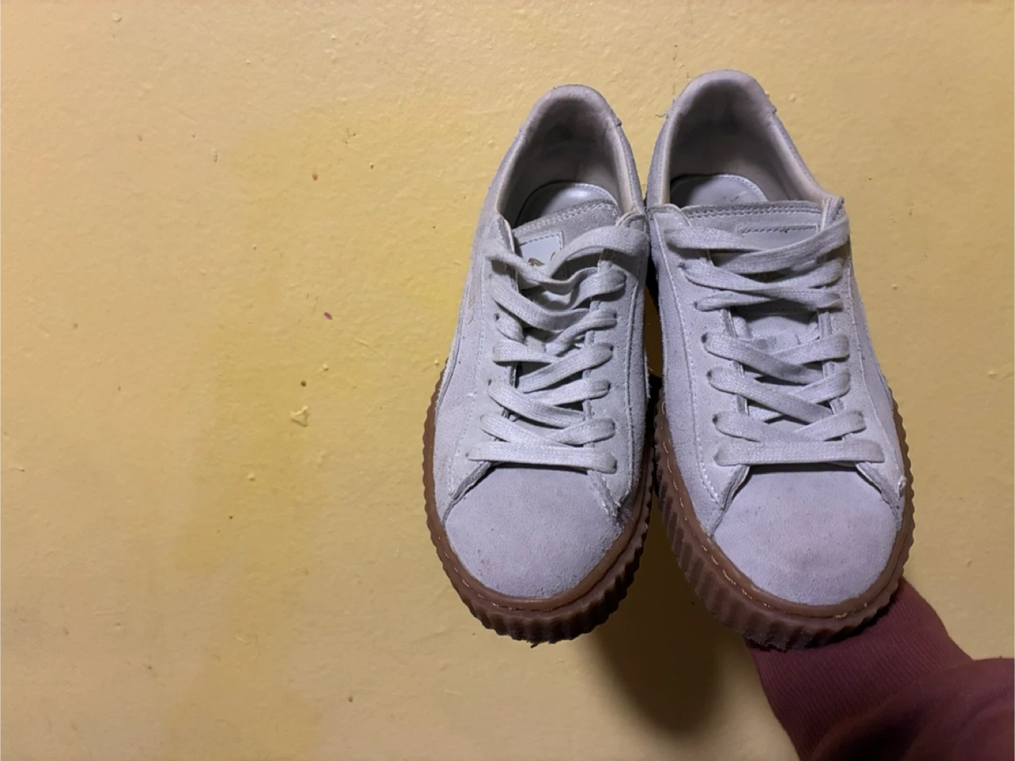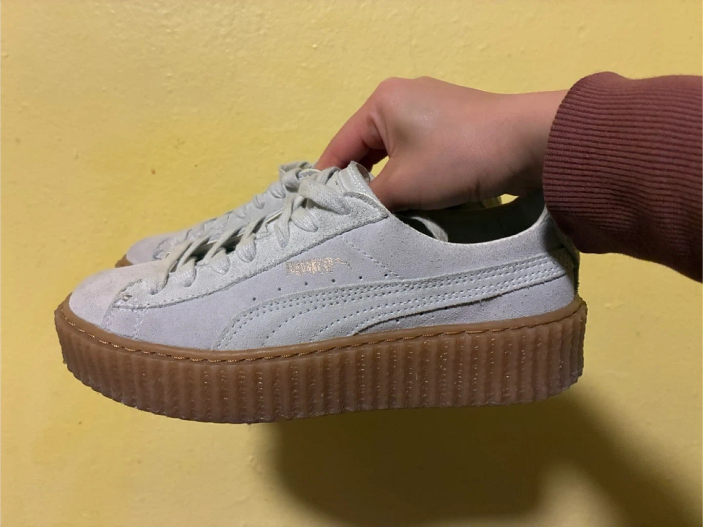 Selling a pair of Puma Fenty Rihanna Cleated Creepers! They are a US size 6.5 The color is a light grey with a brown sole. They are in good condition!