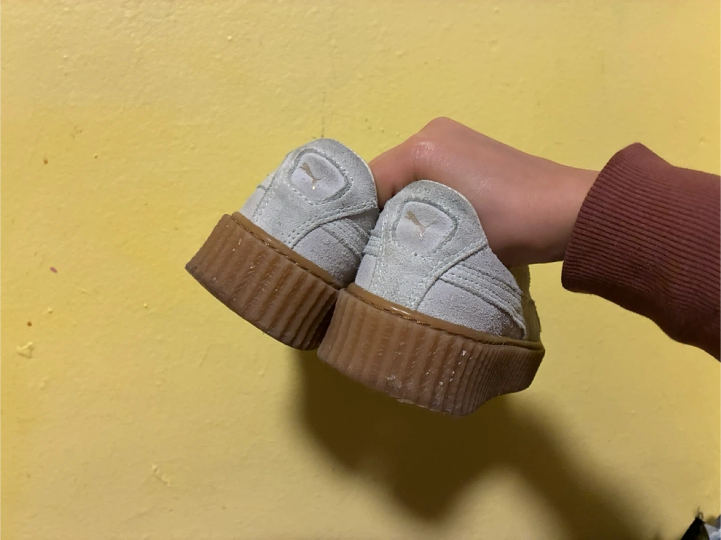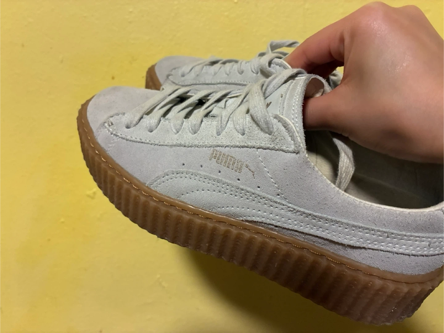 Selling a pair of Puma Fenty Rihanna Cleated Creepers! They are a US size 6.5 The color is a light grey with a brown sole. They are in good condition!