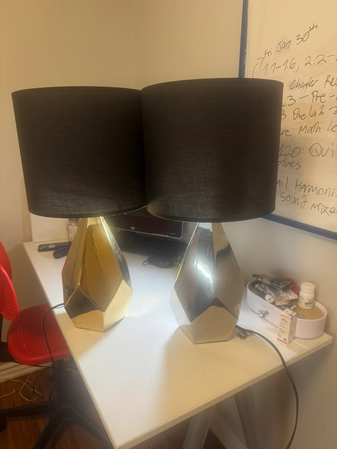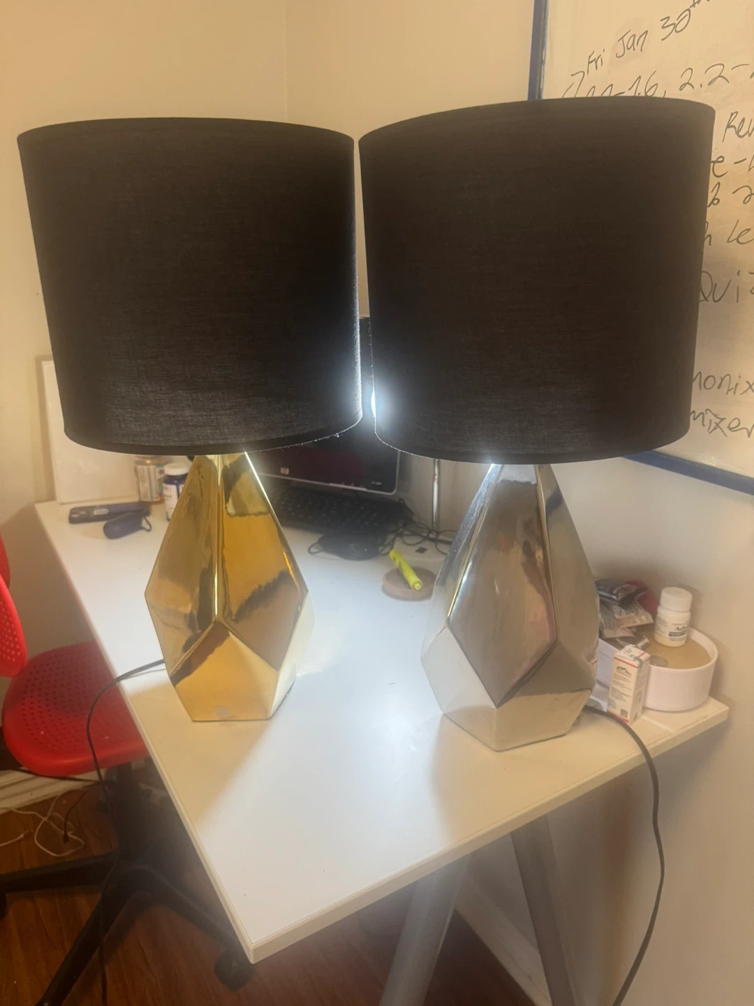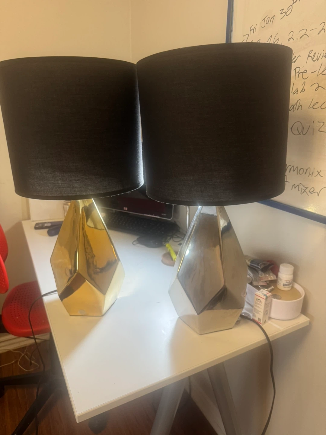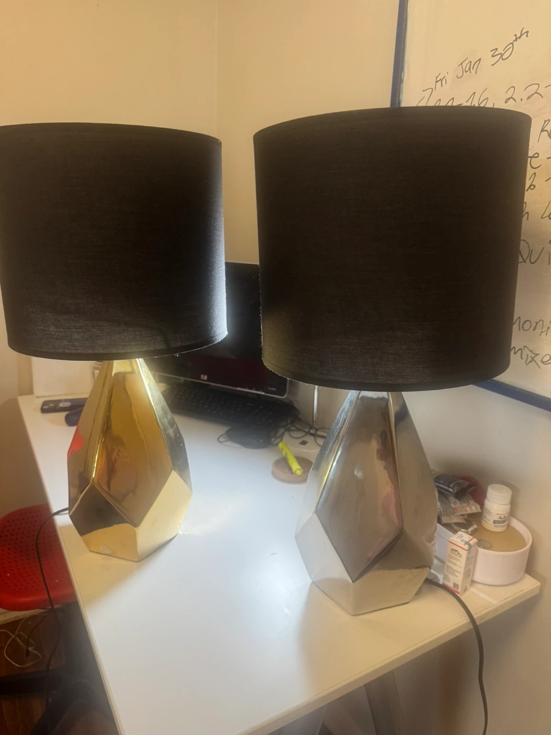 Selling a pair of stylish table lamps! They feature a modern design with black shades and geometric bases. One base is gold and the other is silver. These lamps would be a great addition to any room!