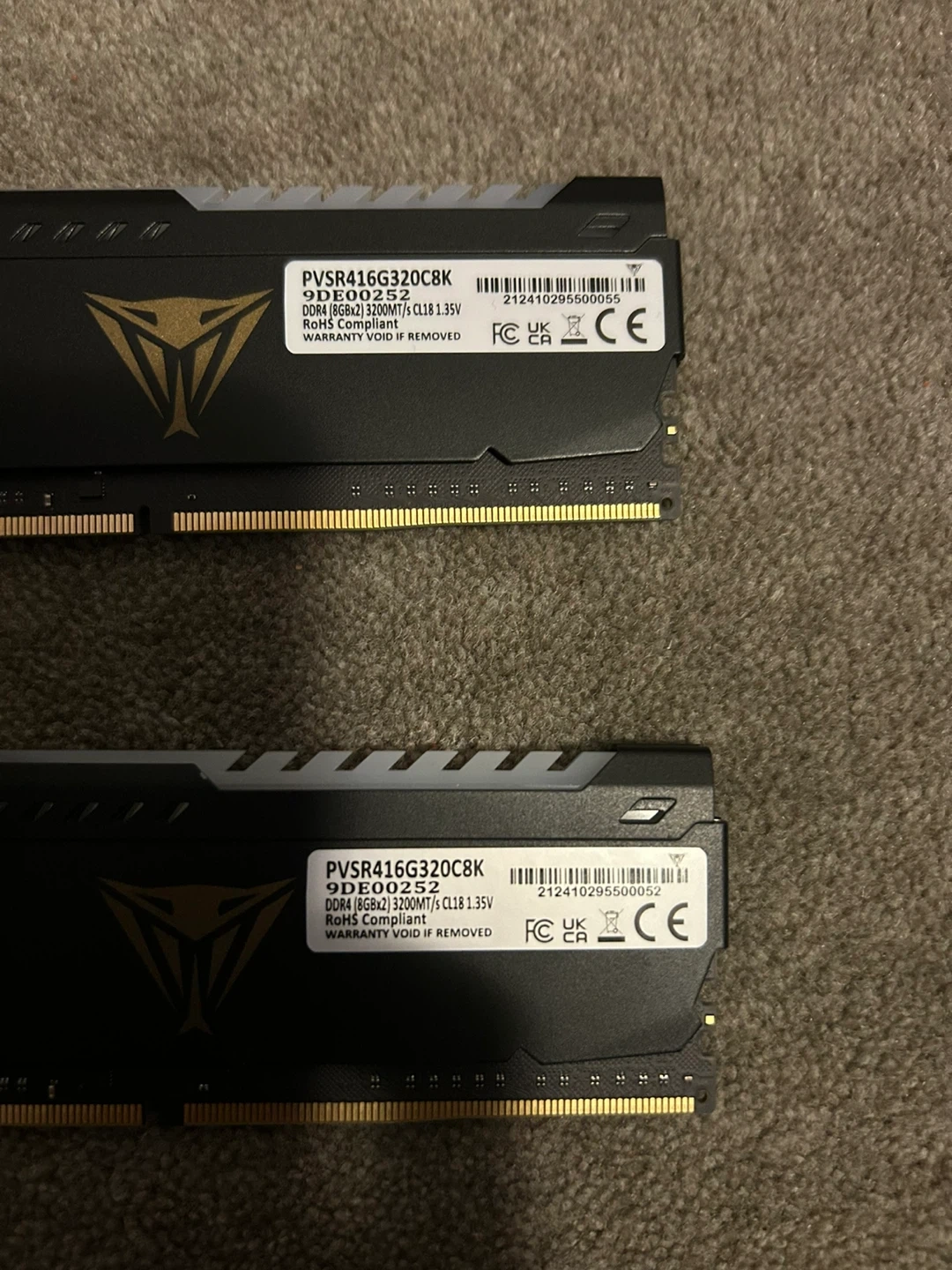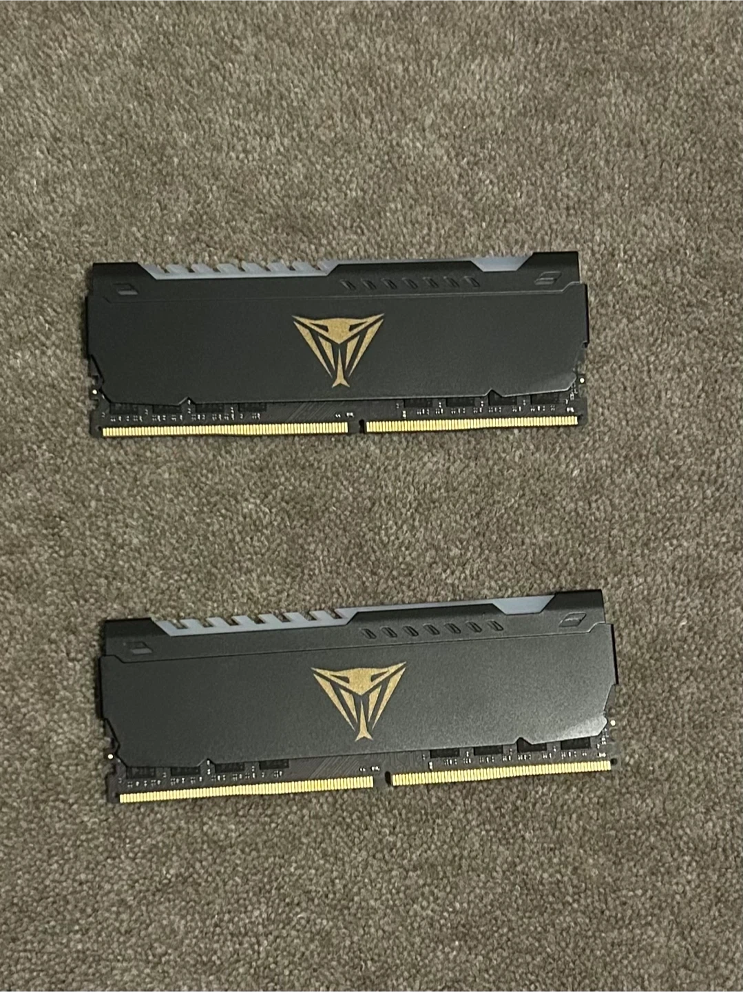 Selling a pair of Patriot Viper Steel DDR4 RAM sticks. Each stick is 8GB, for a total of 16GB. They run at 3200MHz with CL18 timing. Great for upgrading your PC's memory!