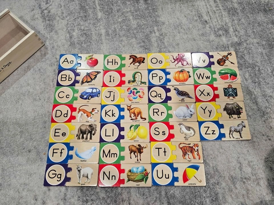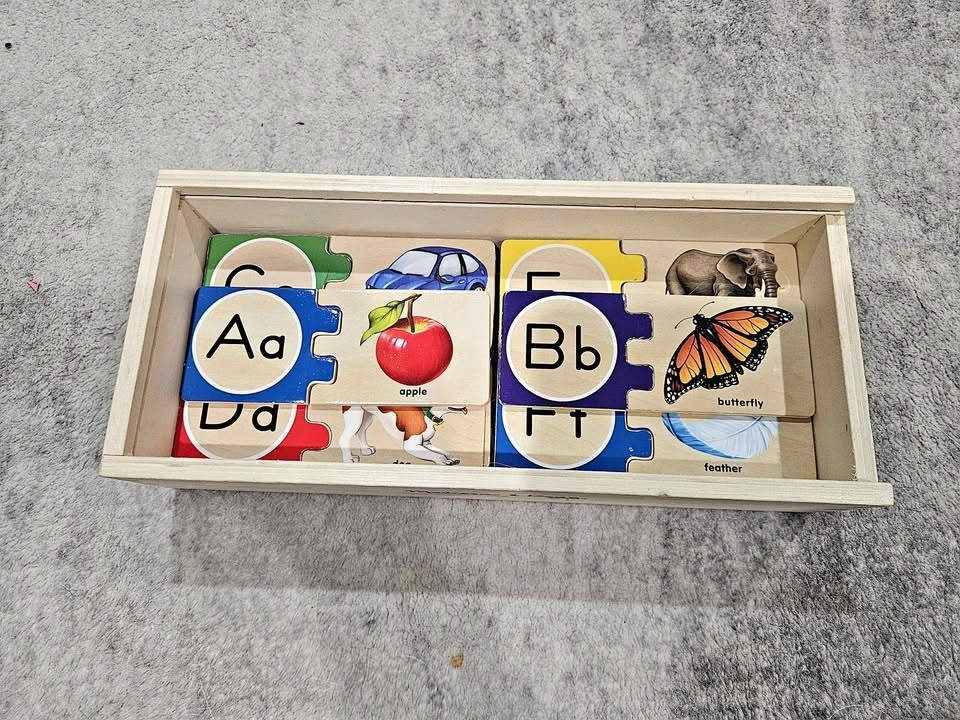 Wooden puzzle pieces with upper‑ and lower‑case matching. Stored in a wooden box — easy to keep together. Great for preschoolers learning letters. Very clean and ready to play.