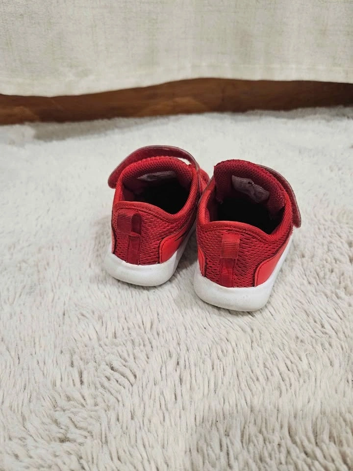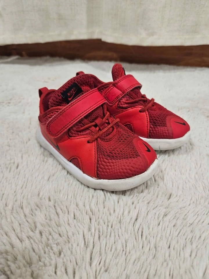 Red Nike toddler shoes in very good used condition. Clean uppers, strong velcro strap, and minimal wear on the soles.