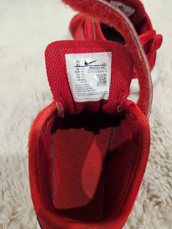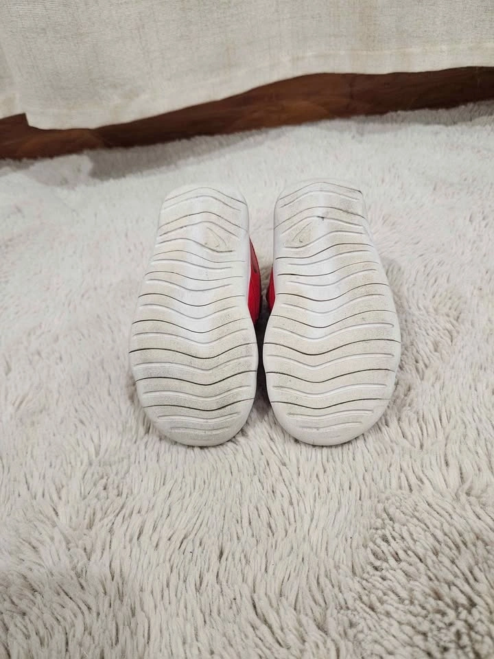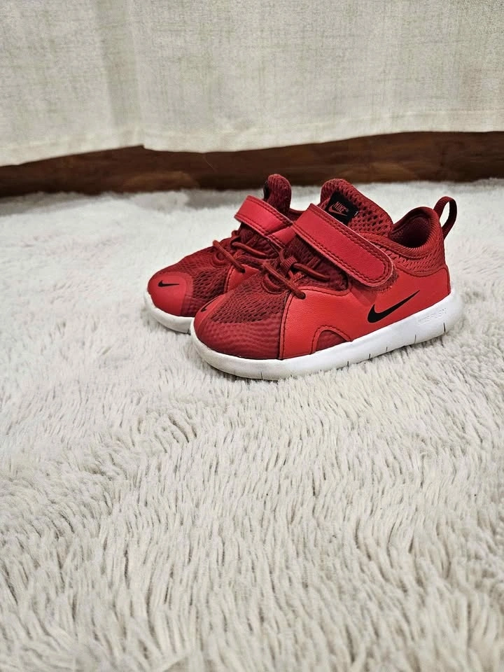 Red Nike toddler shoes in very good used condition. Clean uppers, strong velcro strap, and minimal wear on the soles.