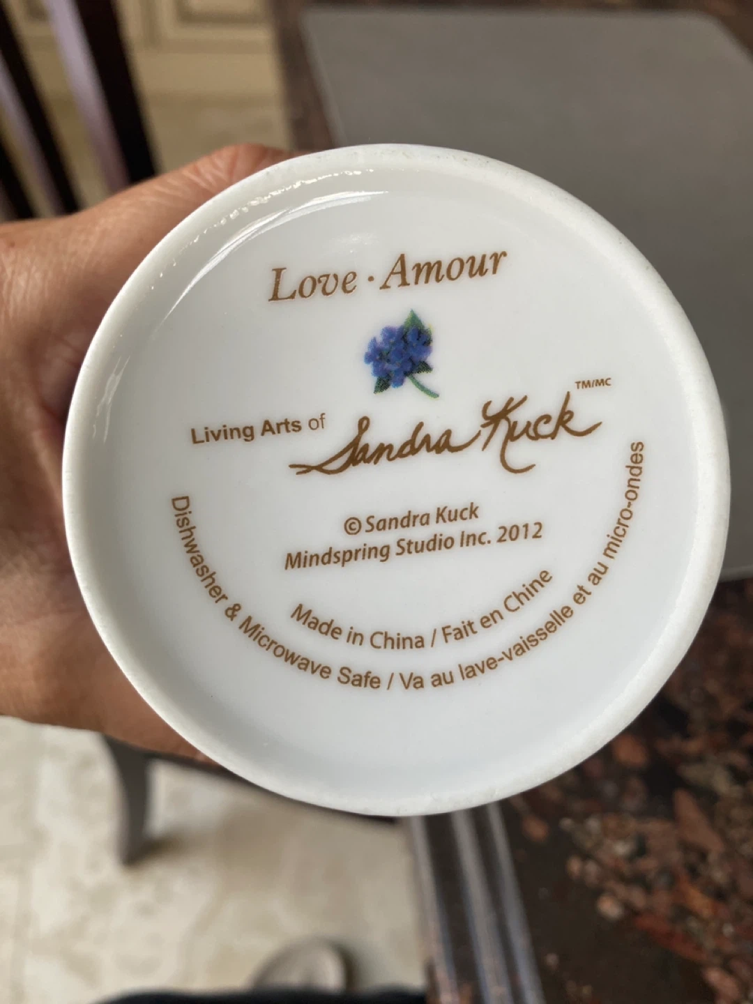 This Sandra Kuck mug features a charming angel design from the Living Arts collection. It's made of ceramic and is dishwasher and microwave safe. The mug was produced by Mindspring Studio Inc. in 2012.