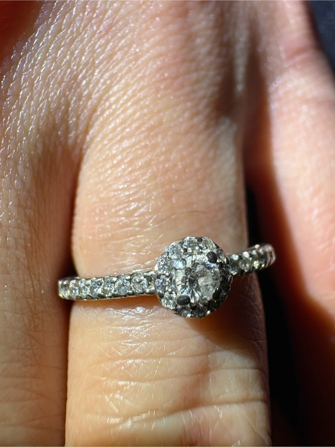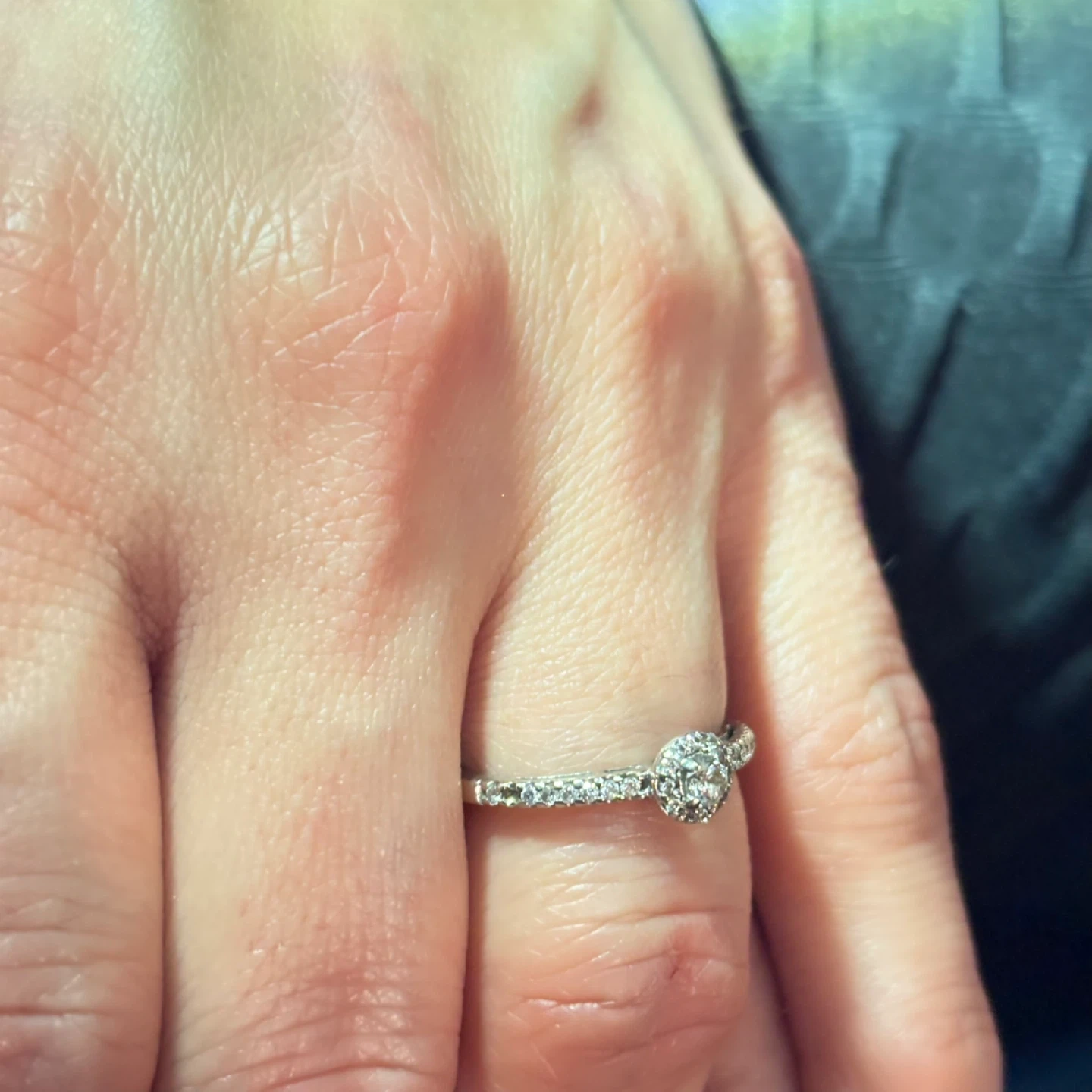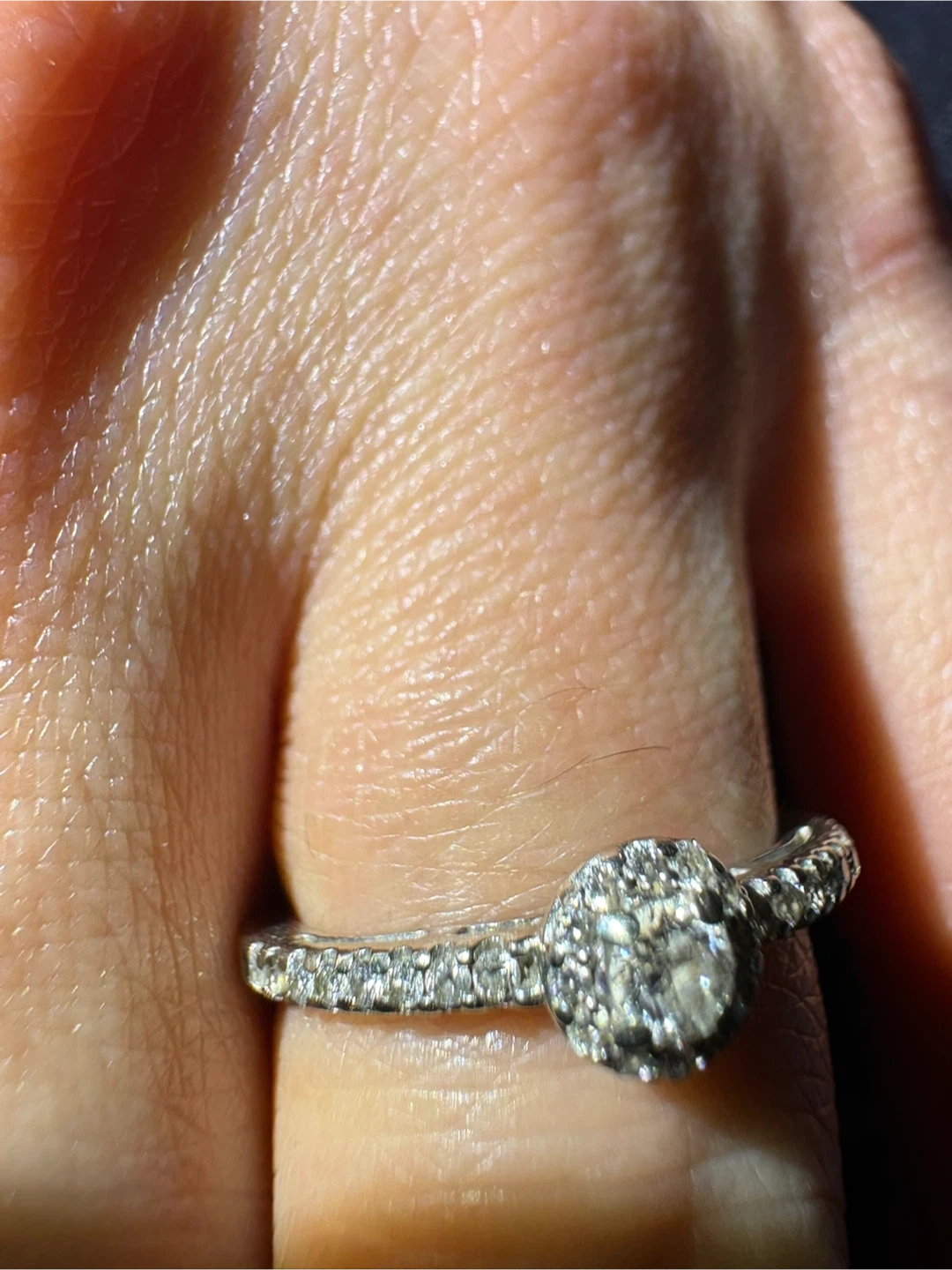Selling a beautiful diamond ring. It features a central diamond surrounded by smaller diamonds on the band. It's in great condition and would make a lovely addition to anyone's jewelry collection