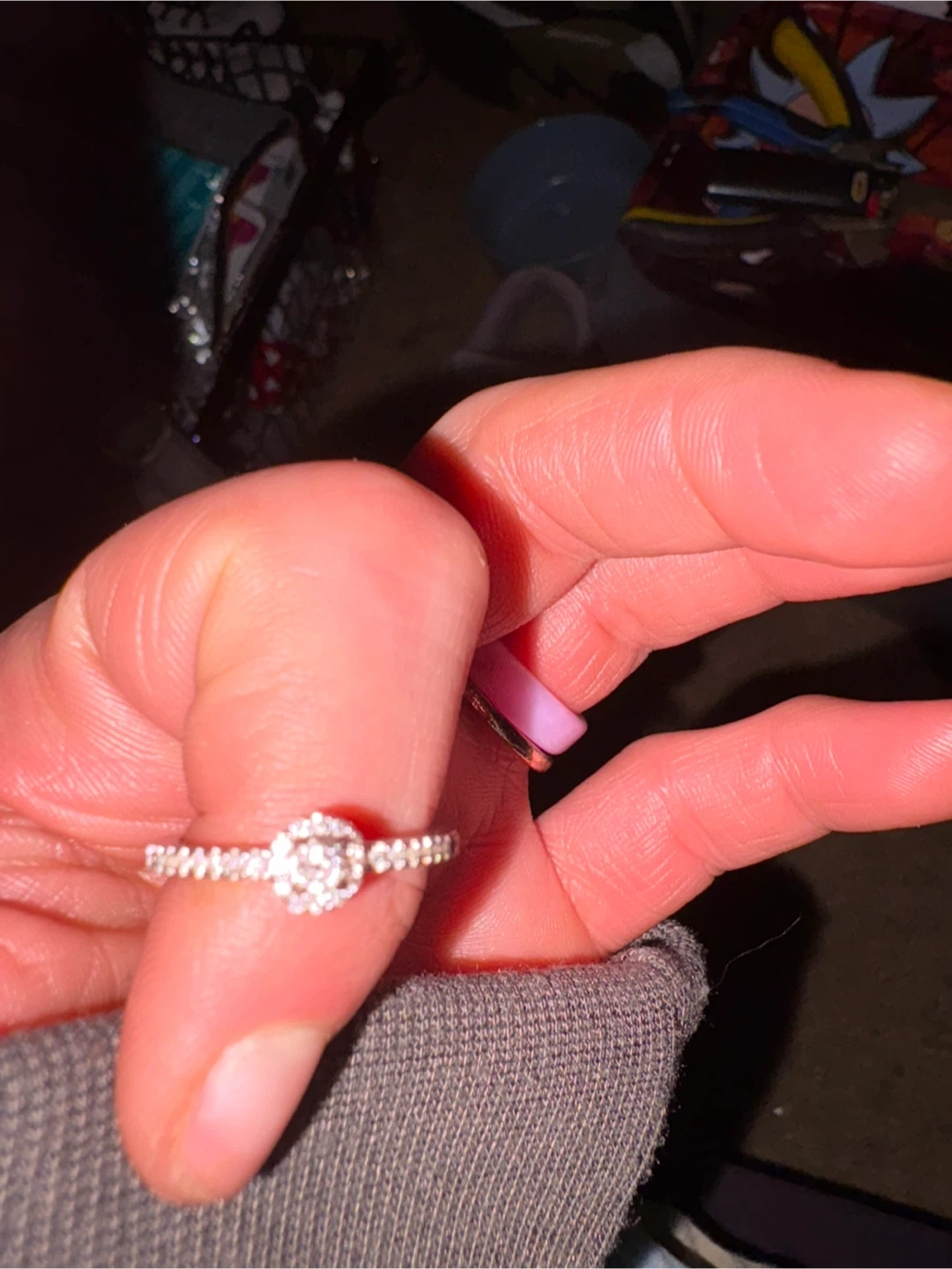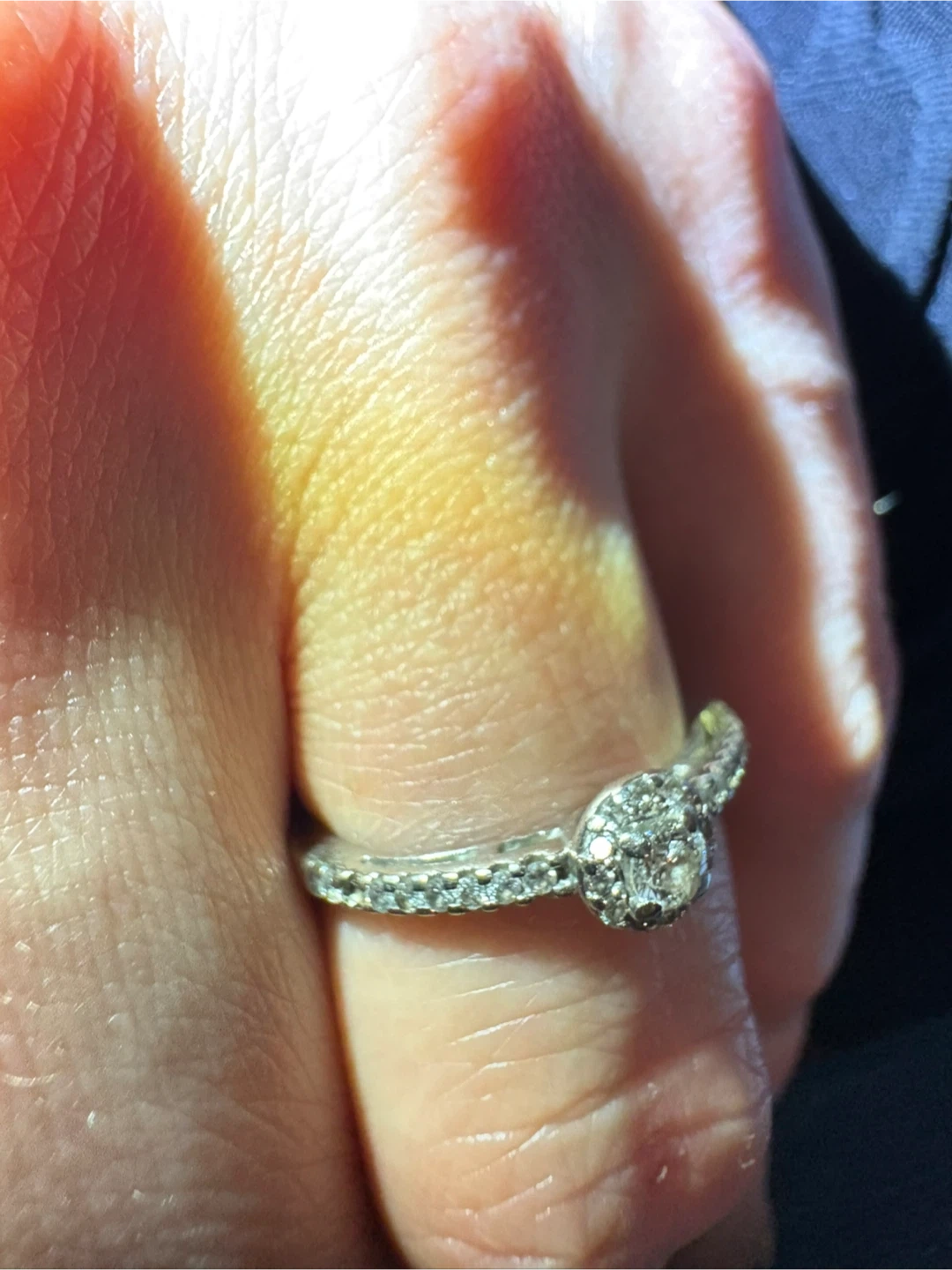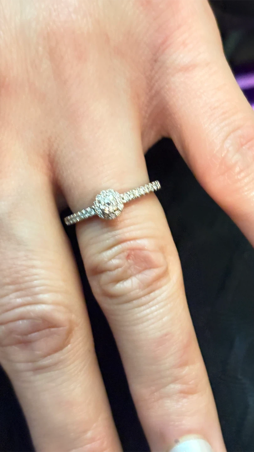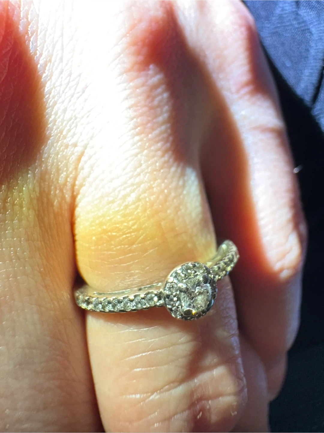 Selling a beautiful diamond ring. It features a central diamond surrounded by smaller diamonds on the band. It's in great condition and would make a lovely addition to anyone's jewelry collection