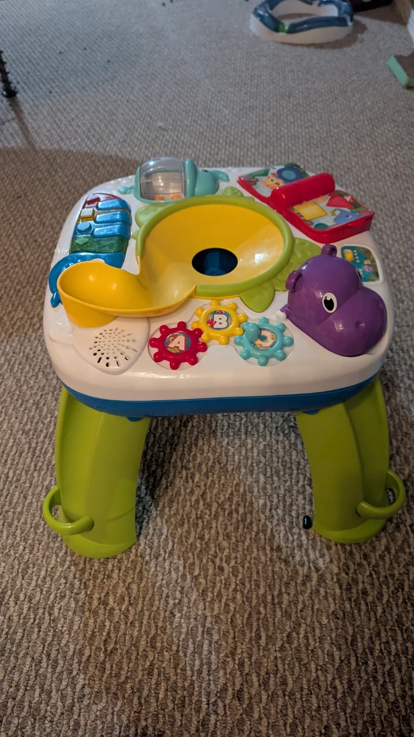 Selling a Bright Starts activity table! It has a variety of interactive features to keep your little one entertained. Perfect for babies and toddlers! Comes with 2 balls as well.
