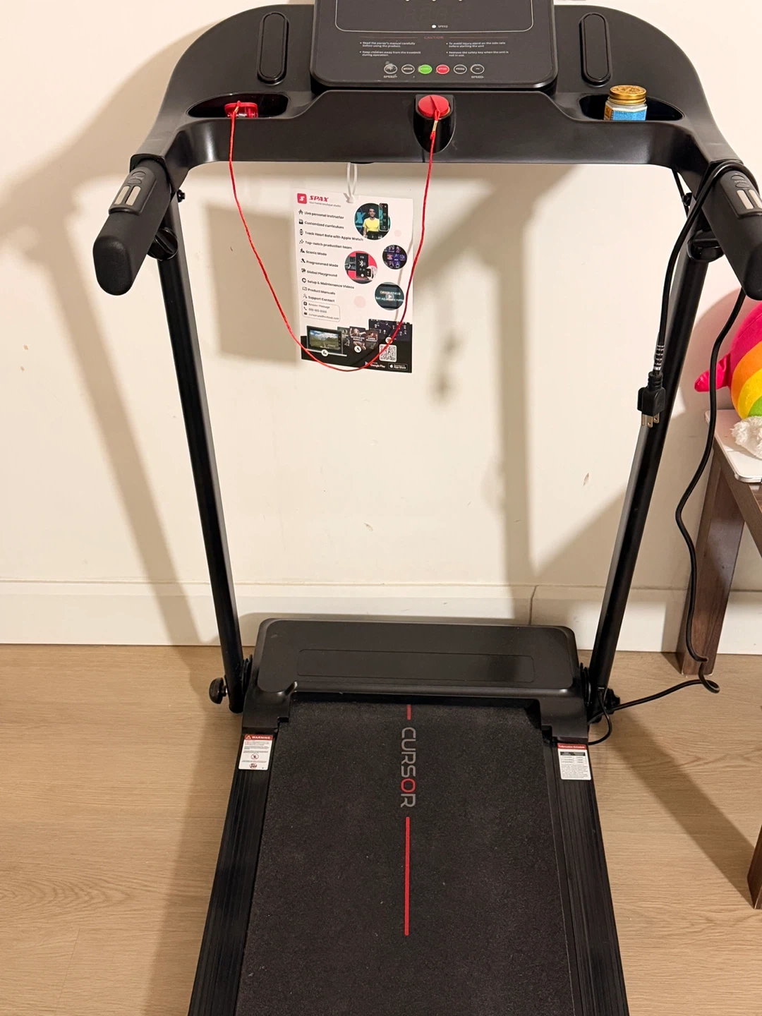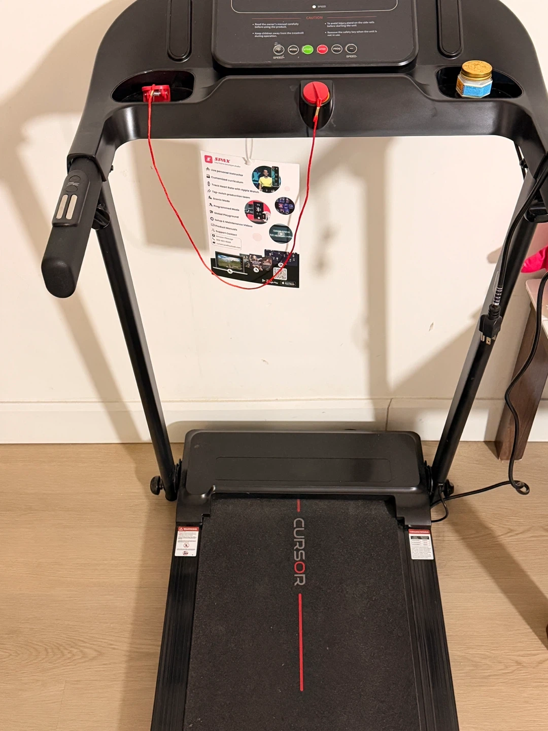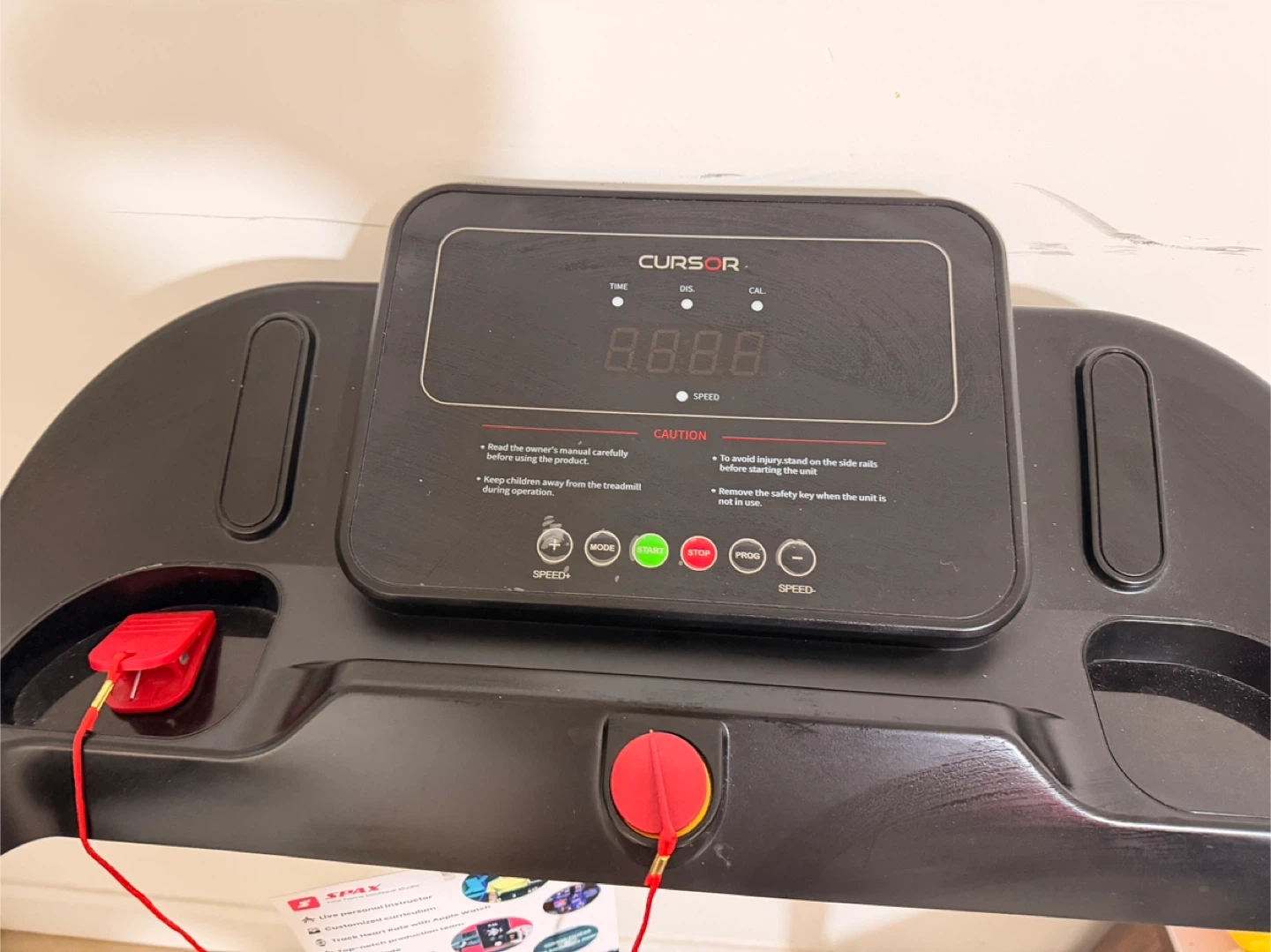 Selling a Cursor treadmill in black. It has a display for time, distance, and calories. It also shows the speed. It's in great condition and ready for a new home gym!