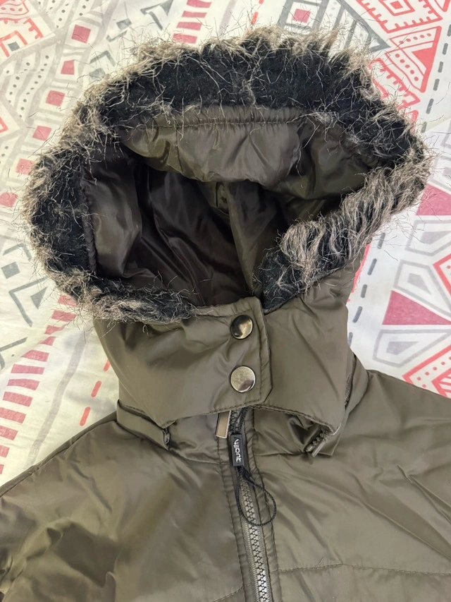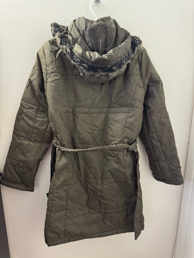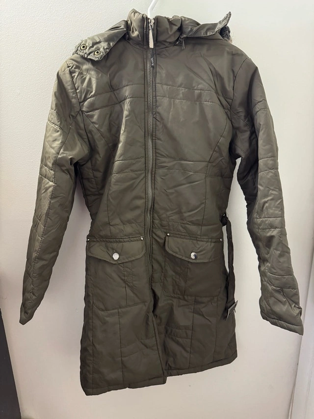 It says XXL on the tag, but it looks more like a small or medium. It might be an imported XXL size, which runs smaller than US sizes. I can get measurements if needed, just let me know. Stylish olive quilted long jacket with front pockets and zipper closure. Perfect for chilly days. This used jacket features a flattering silhouette and practical design, ideal for transitional weather.