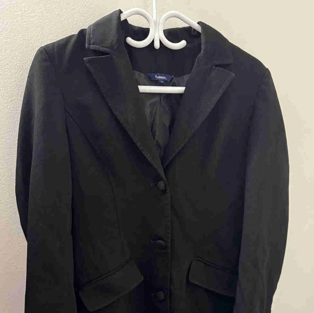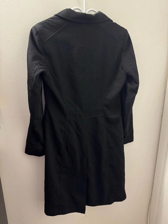 This is a stylish black Reitman's trench coat in US size 3, perfect for adding a touch of elegance to any outfit. While it is a used item, it's in good condition. It features a classic design with a button-up front and a flattering silhouette. Features: * Brand: Reitman's * Size: US 3 * Colour: Black * Style: Trench Coat * Closure: Button Looking for a stylish coat that won't break the bank? This Reitman's trench coat is a great find! It's ready to keep you looking chic. Don't miss out—if you're seeing this ad, it’s still available!