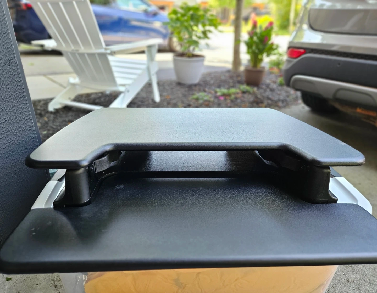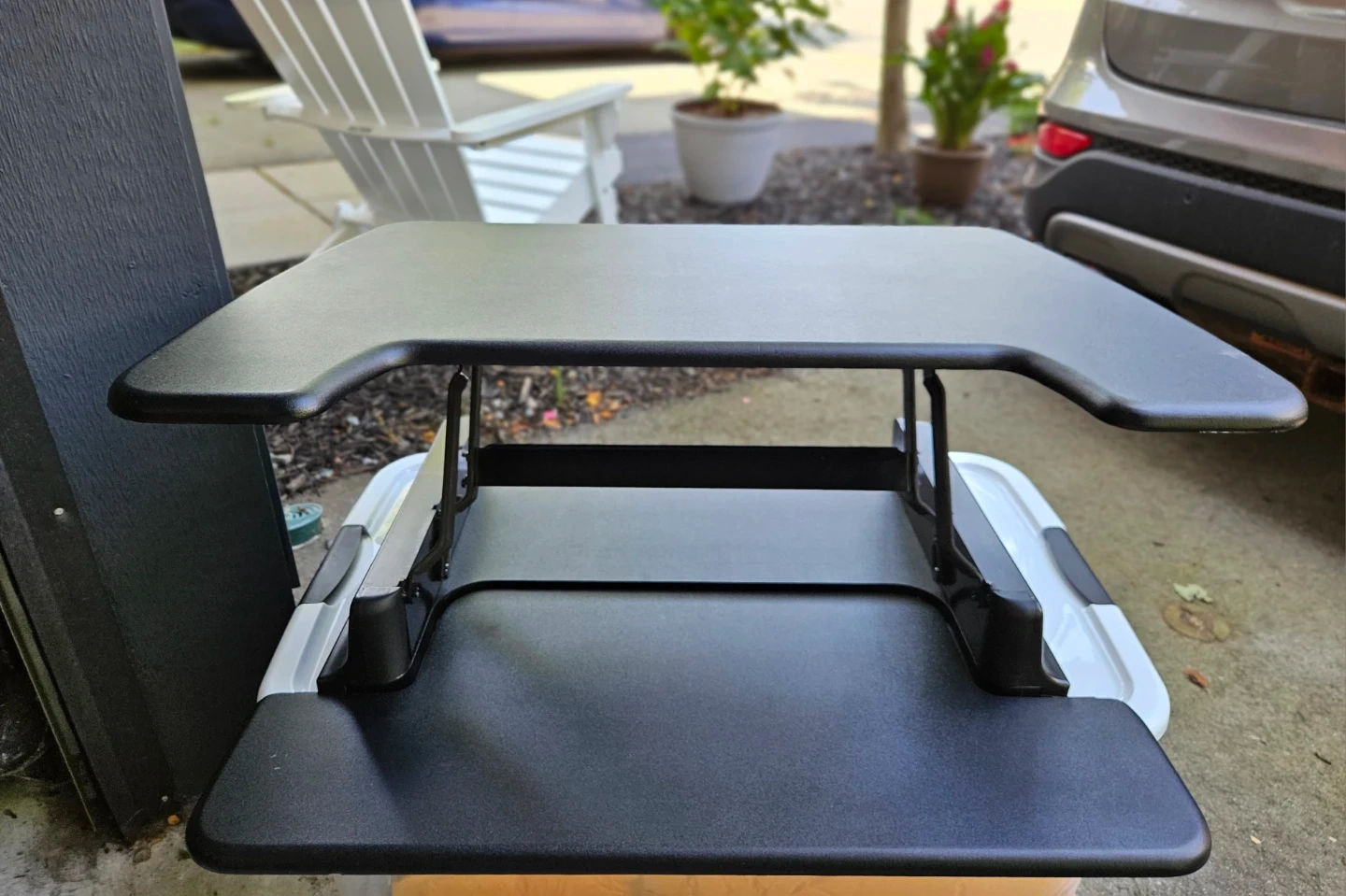 Selling my standing desktop converter. It's in great shape and perfect for turning any desk into a standing workstation. It's black and easy to adjust to different heights, making it super versatile for any user.