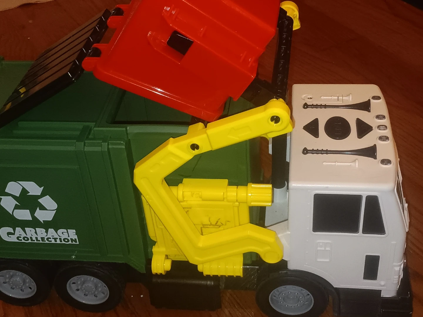 Selling a toy garbage truck with a red dumpster. It's in good condition and ready for a new home! Features include a green garbage truck with a recycle logo and a yellow caution sign on the back. Lights turn on.