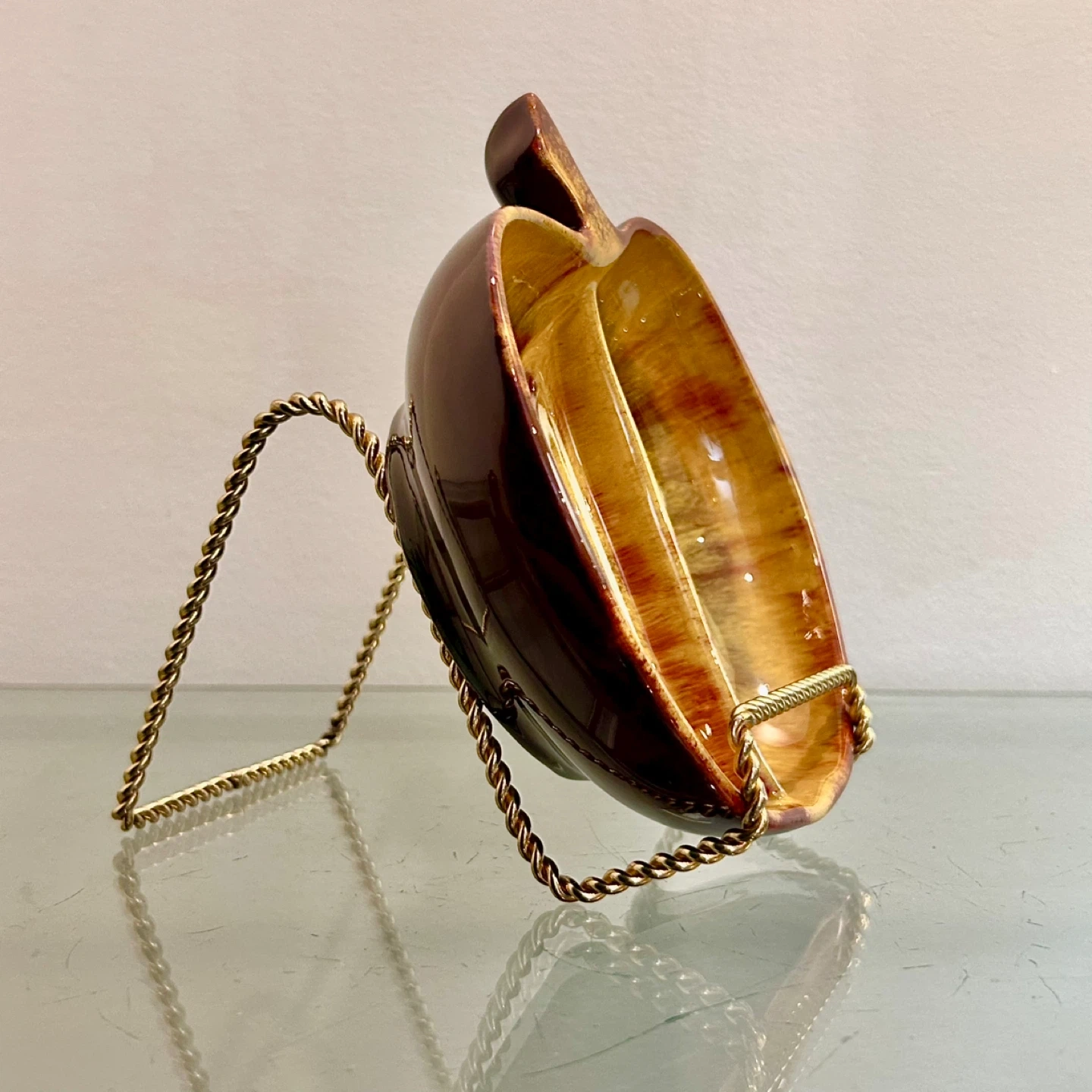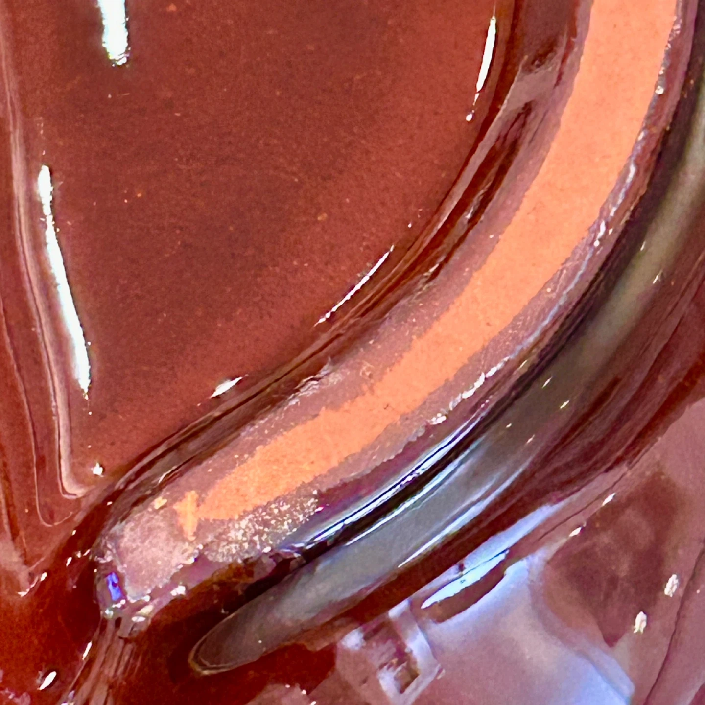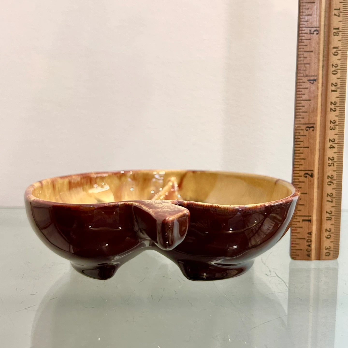 Mid-century modern, MCM pottery, studio pottery, drip glaze, run glaze, oxblood glaze, amber glaze, apple dish, divided dish, relish dish, condiment dish, vintage art pottery, sculptural ceramics.