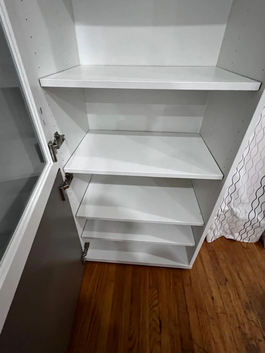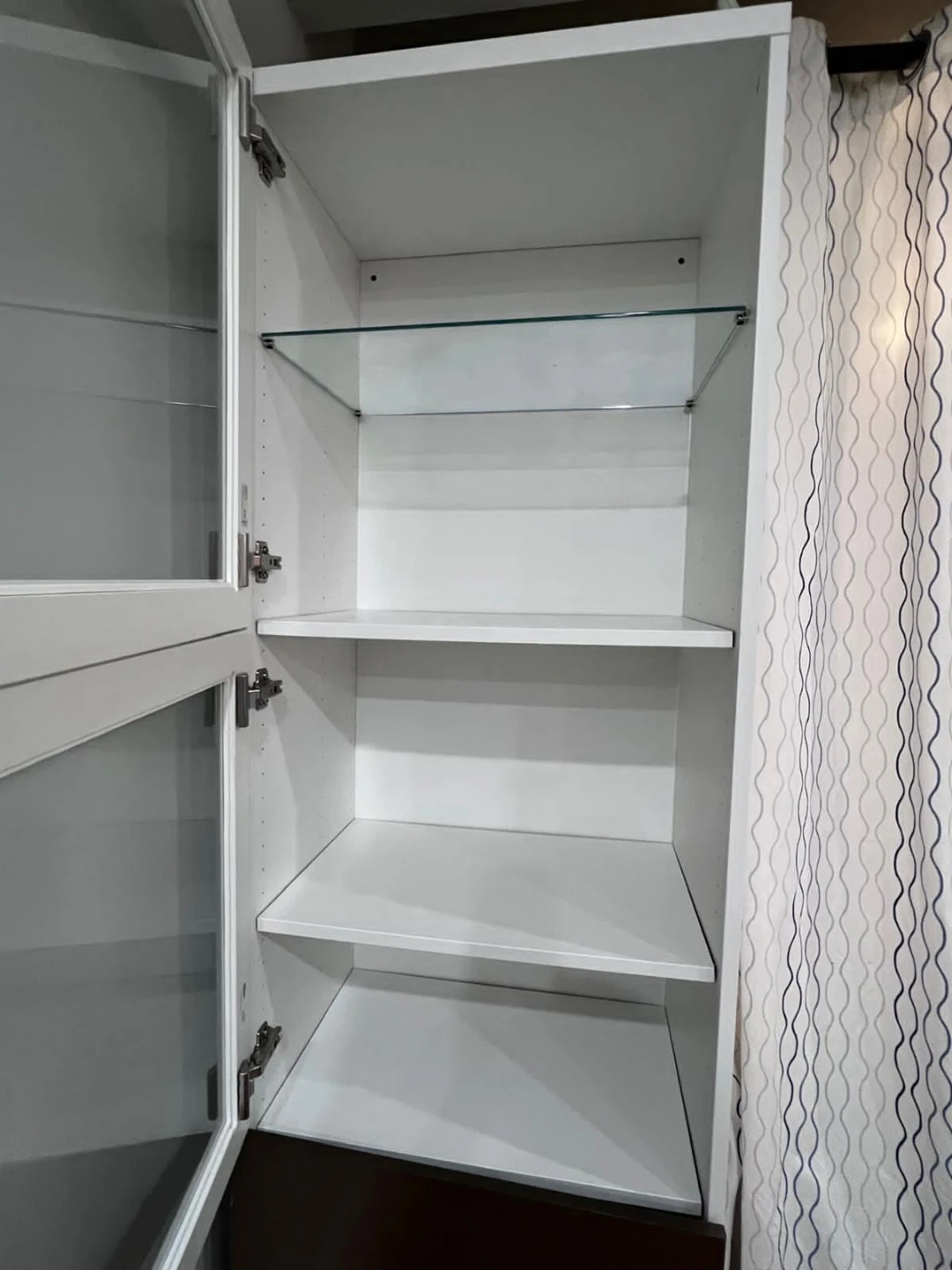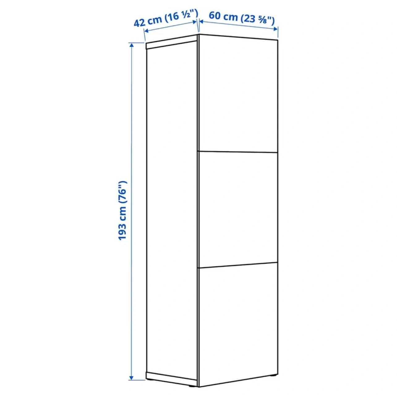 Selling a used IKEA Besta combination with a glass door. This unit features adjustable shelves and a sleek design. The bookcase is white with a dark brown base and two glass cabinet doors. Dimensions are approximately 42 cm (16 1/2") wide, 60 cm (23 5/8") deep, and 193 cm (76") tall.